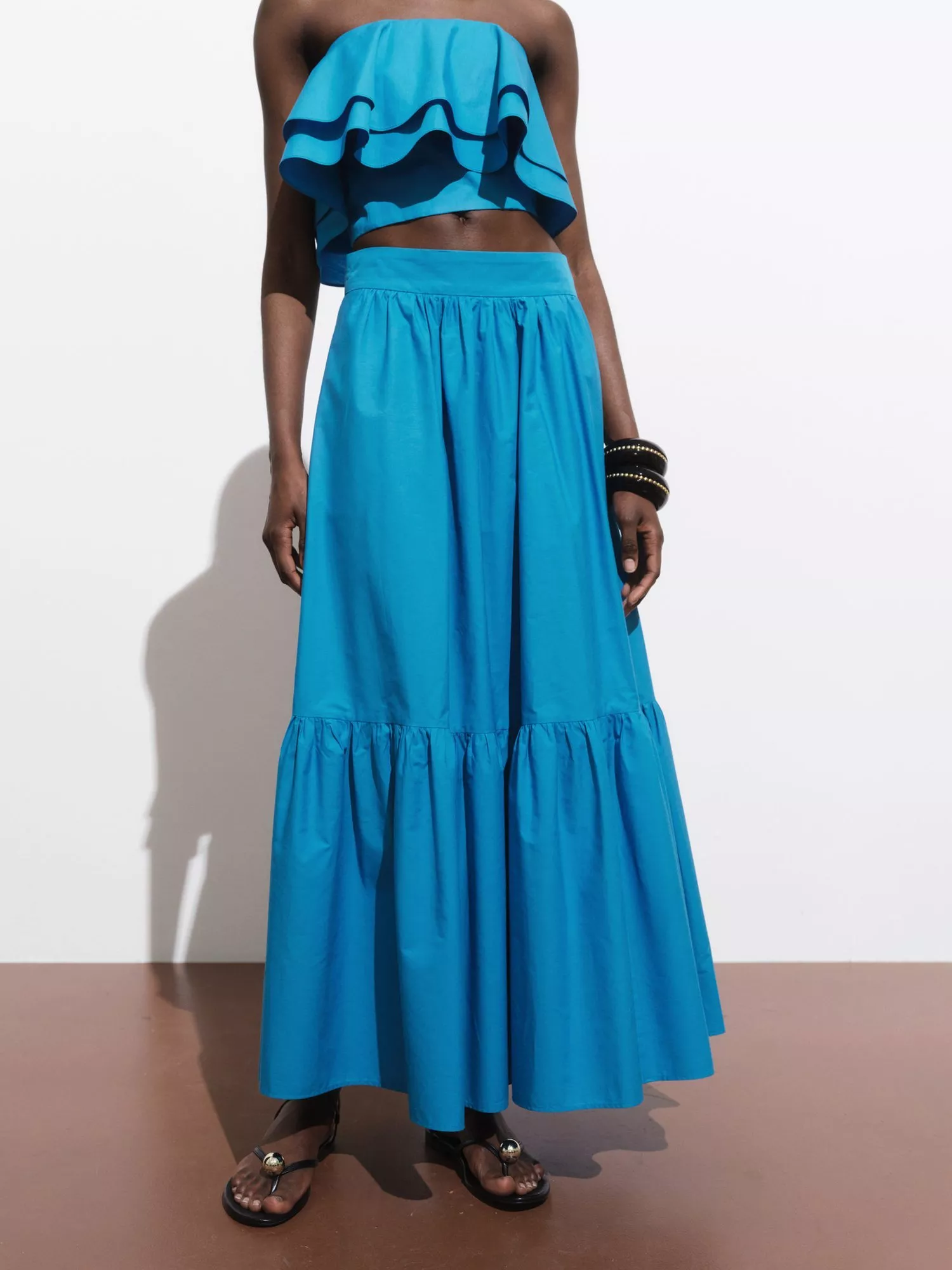 A maxi-length skirt from Mango. Rhythmic volume in a tiered silhouette, it comes in pure cotton, perfect for relaxed days out or a spontaneous catch-up with friends.