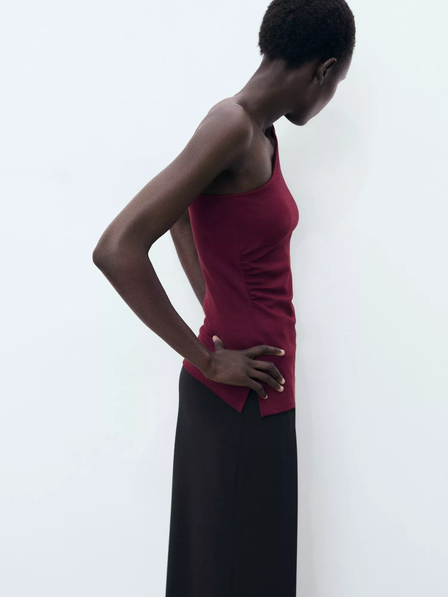 Carved with an asymmetric neckline, this sleeveless blouse from Mango features ruching at the waist.