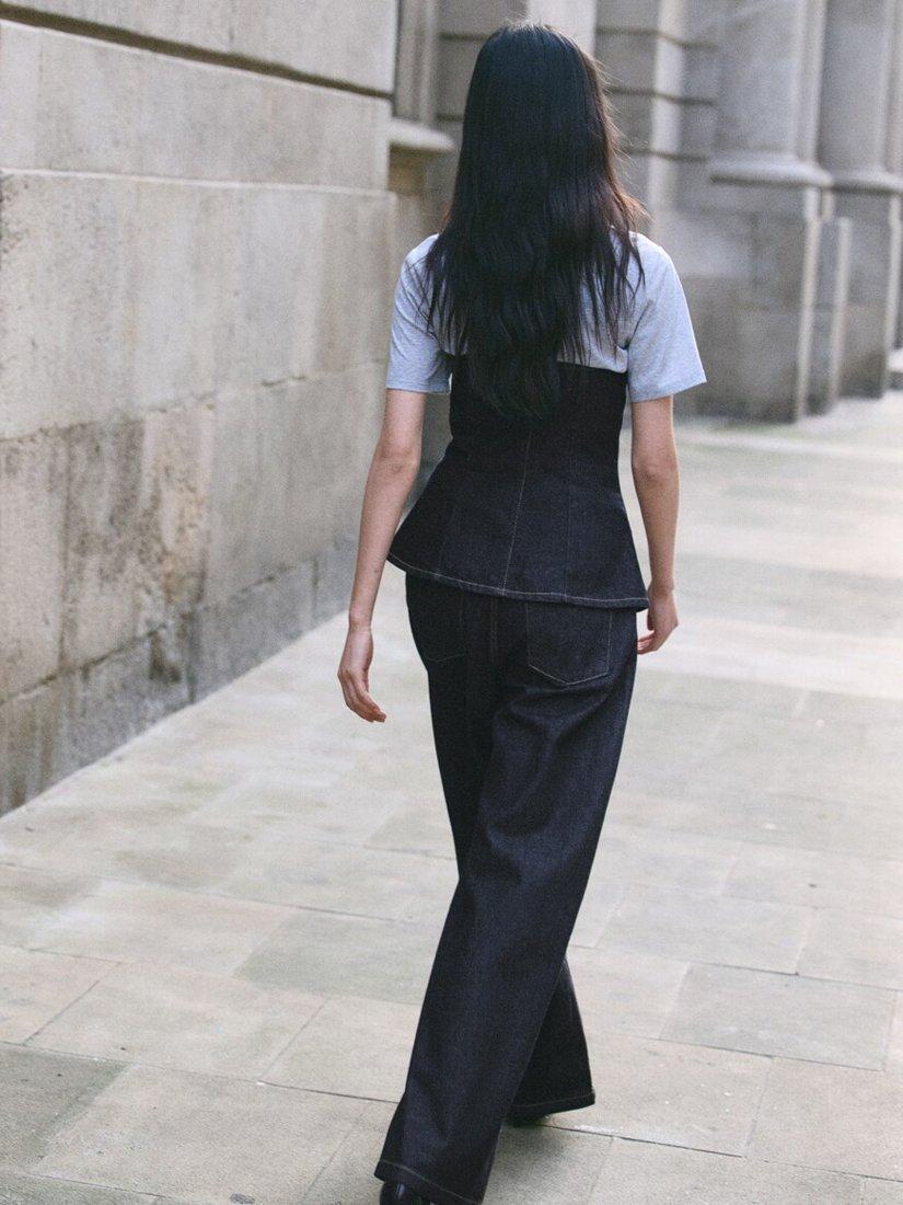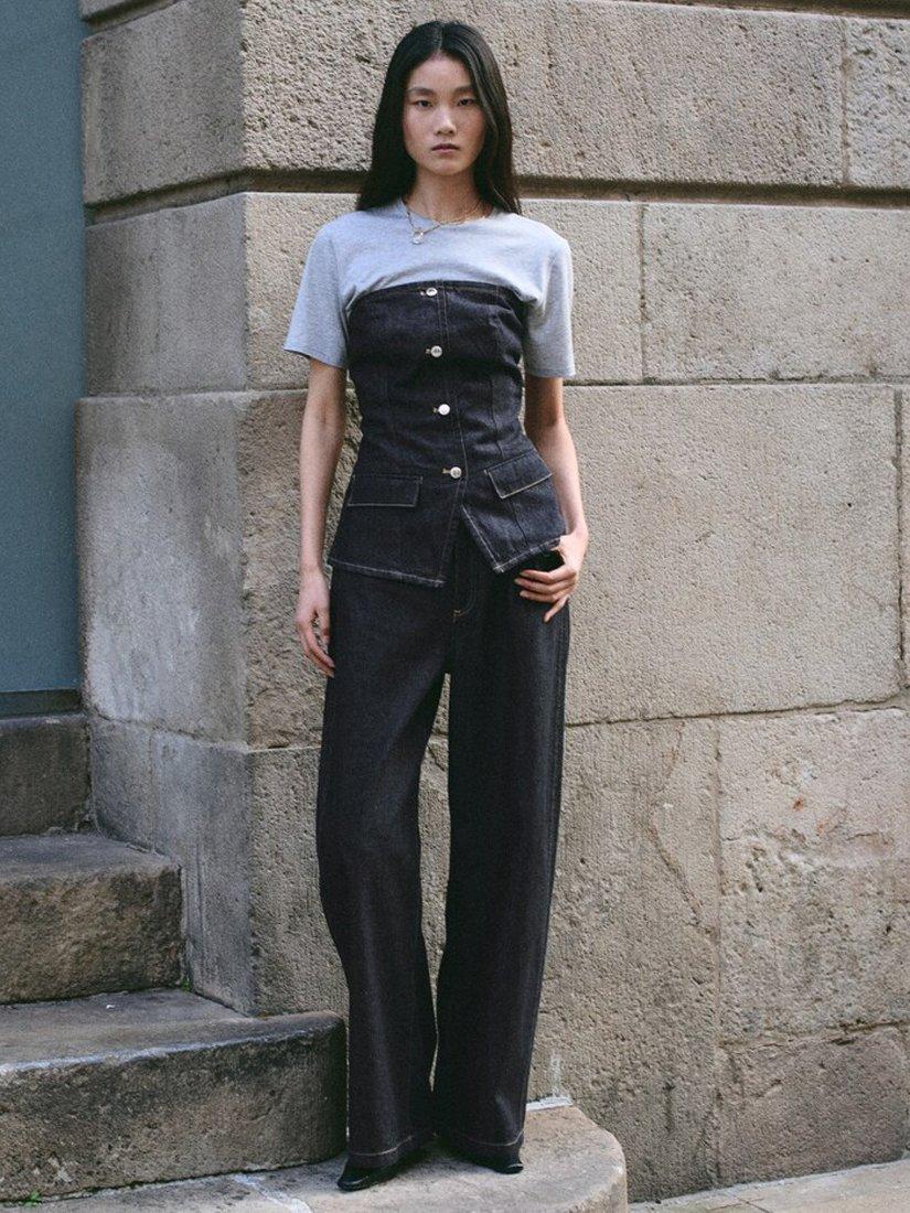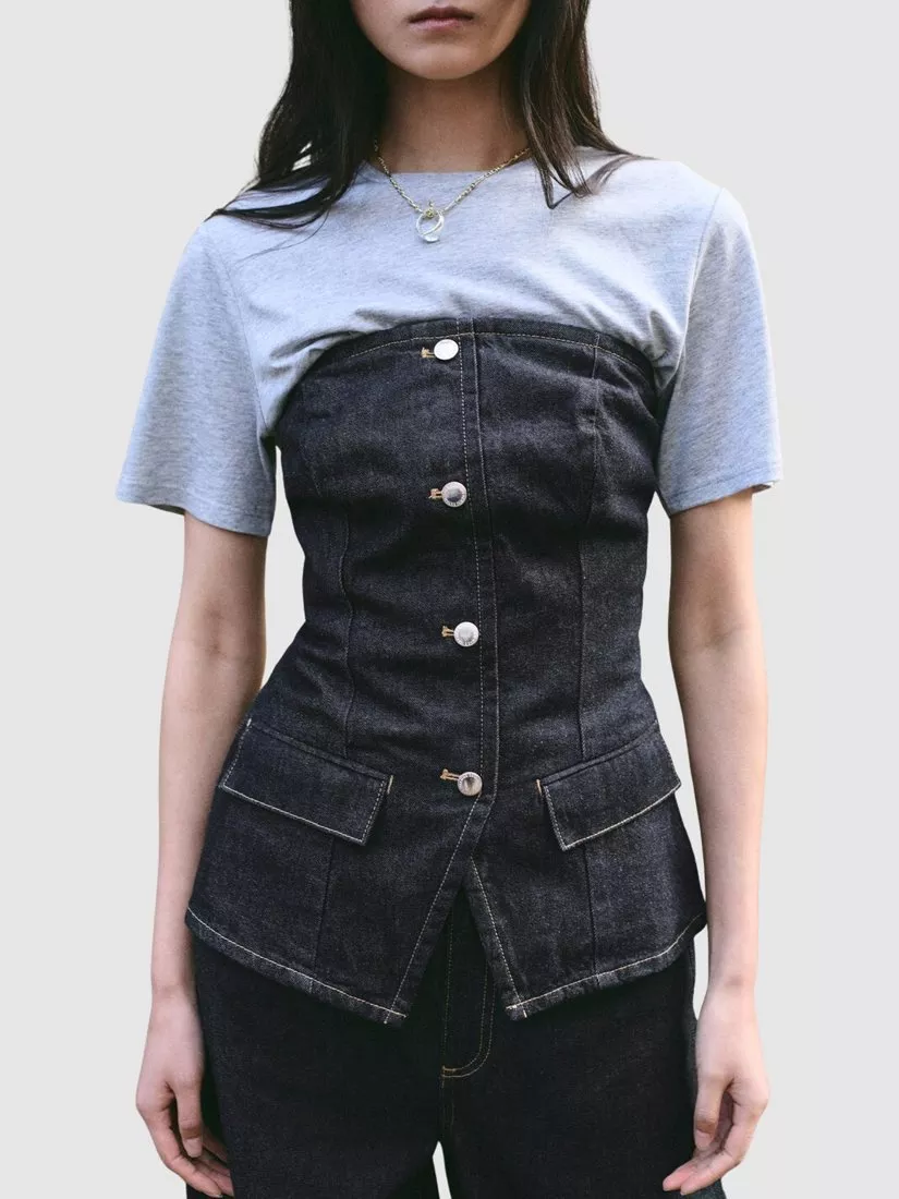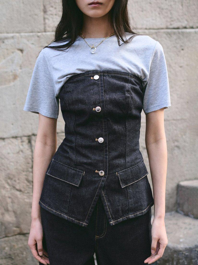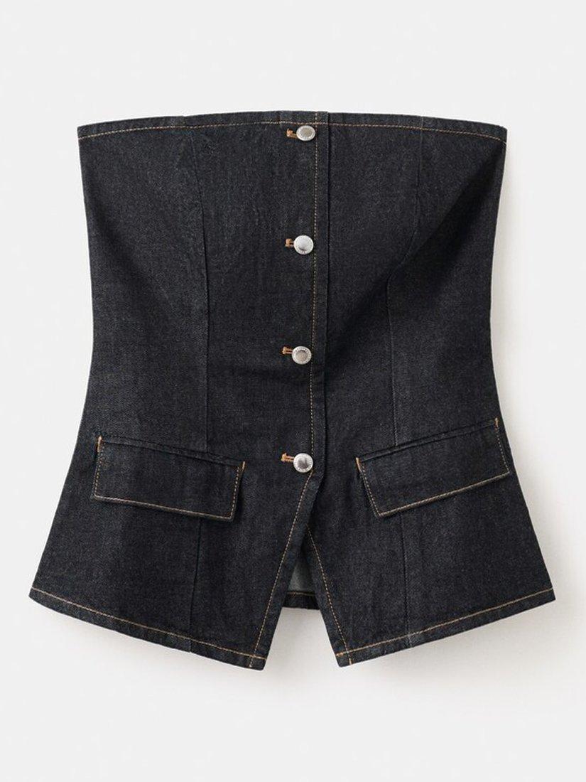 Contoured bustier silhouette sculpts an hourglass shape, front buttoning and tailored seams create structure, ideal for city-to-evening styling.