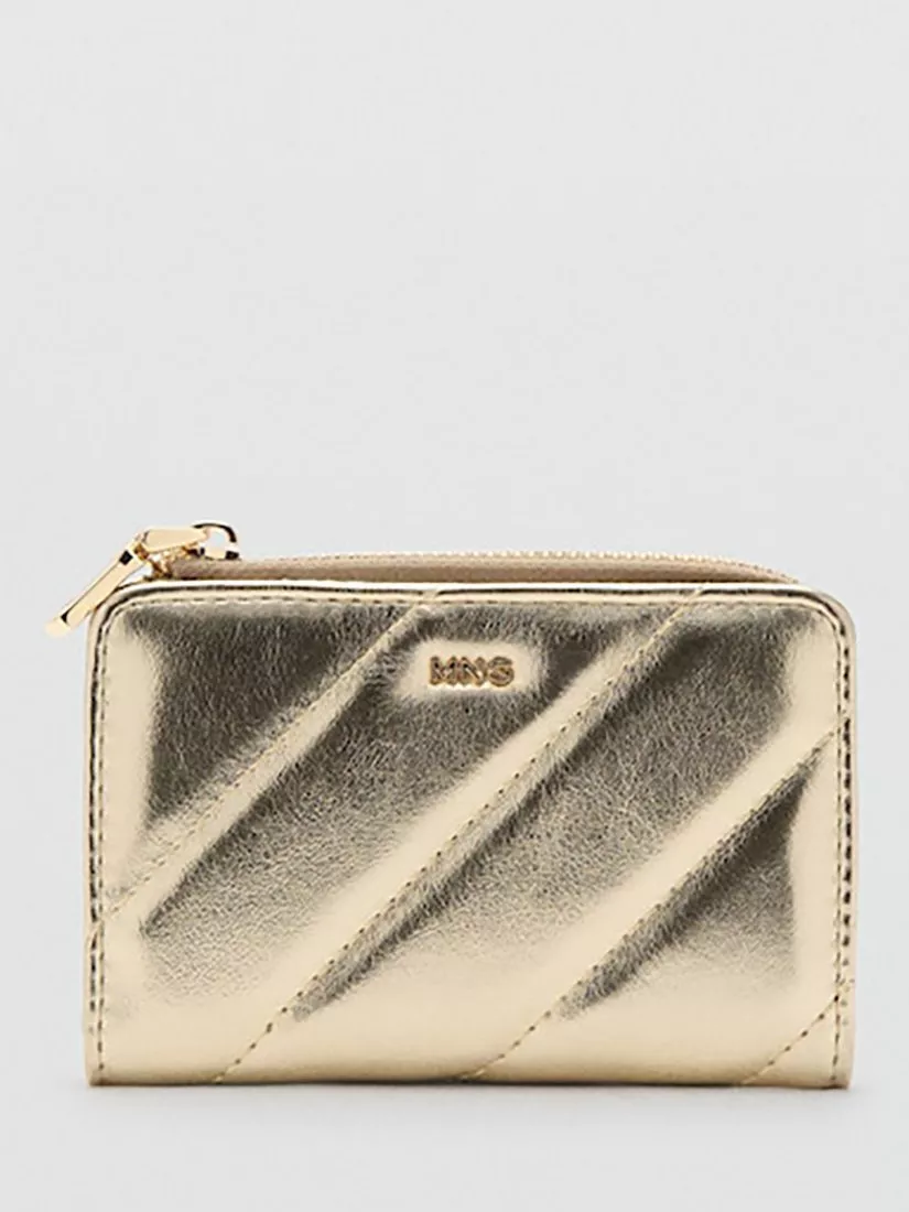 A diagonal quilted metallic purse. Fastened with a snap closure, it opens to reveal ample card storage and a zipped pouch section for coins.