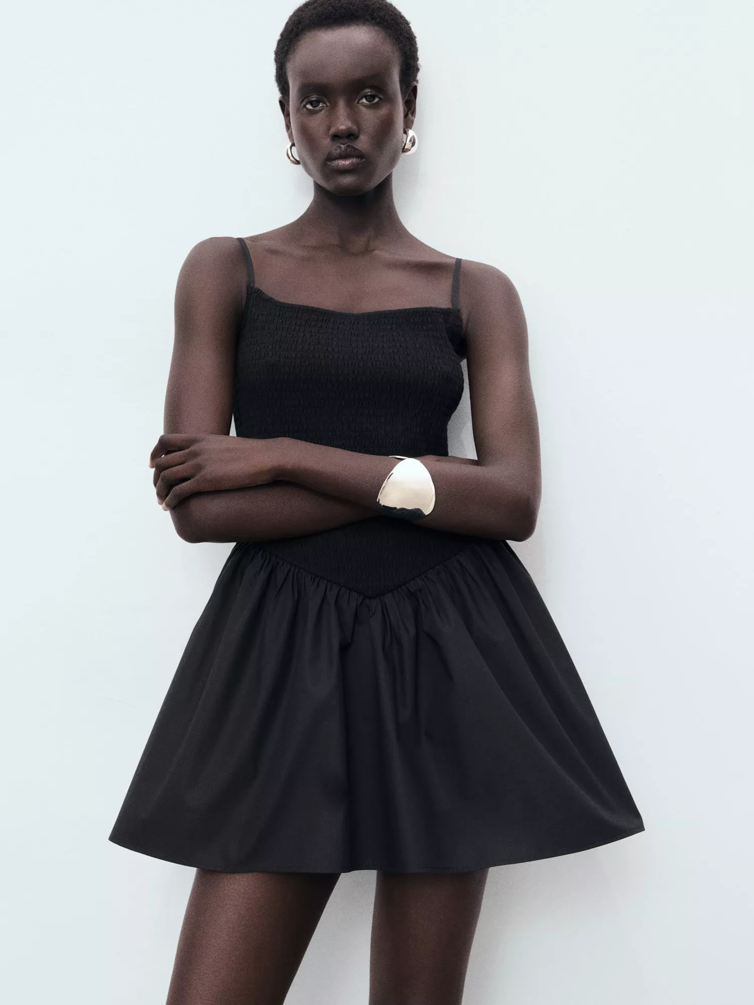 With a fitted stretchy bodice and a flared cotton skirt, this mini dress features a square neck, spaghetti straps and a dropped V-waist.
