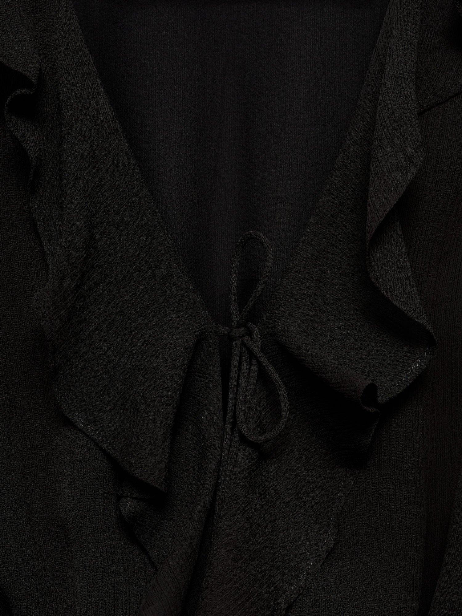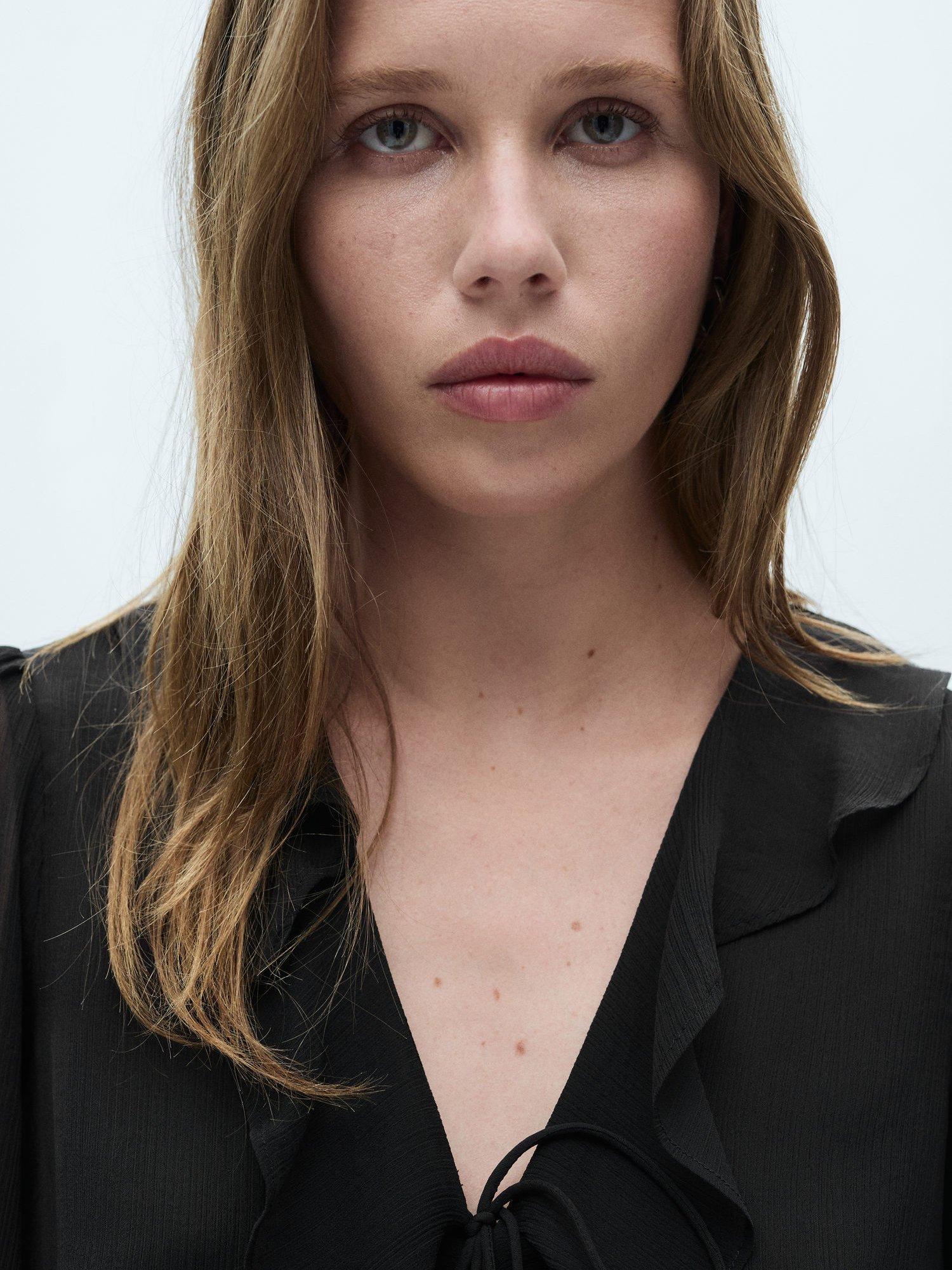 Accentuating the figure with a skater shape, this thigh-grazing dress from Mango is made from a soft flowy fabric. With a ruffle v-neckline and full-length sleeves with knotted cuffs, this style comes without pattern or print so you can set your imagination and creativity free when it comes to accessorising.