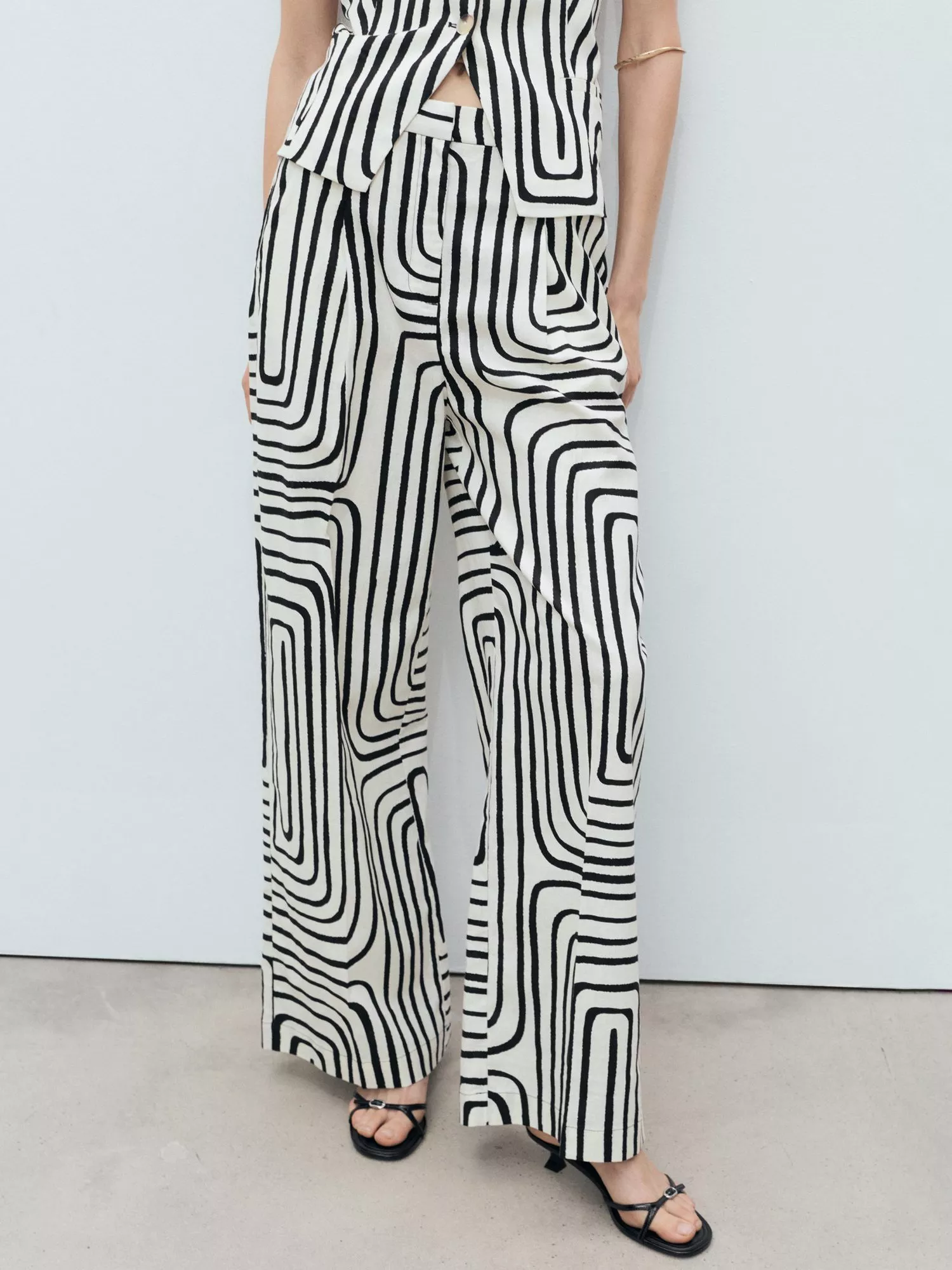 Straight leg trousers by Mango crafted from a linen-blend. They sit mid rise with a hook and zip fastening, geometric print and a regular length.