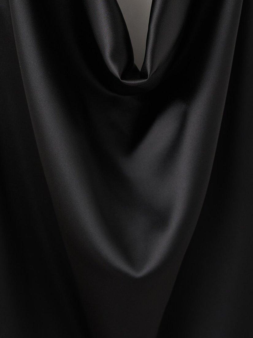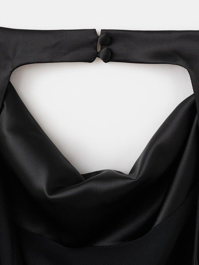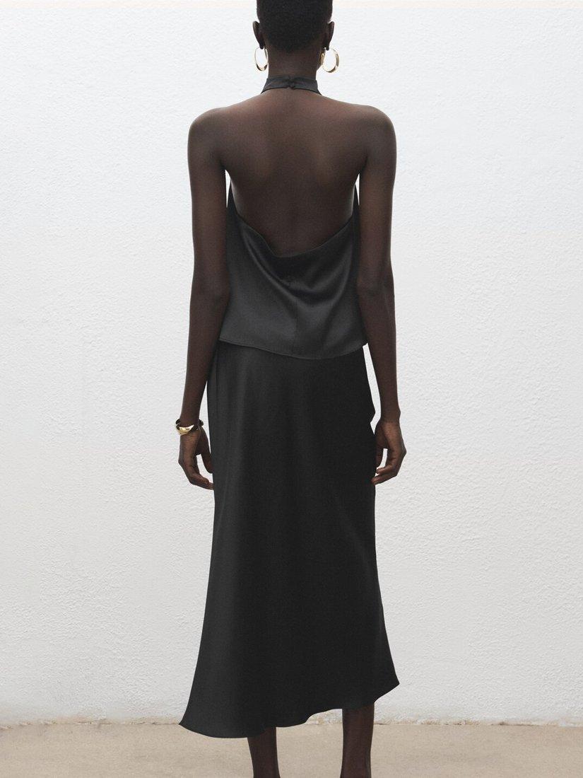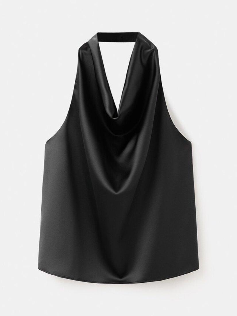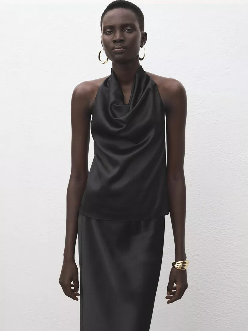 A sleeveless satin blouse from Mango. With a sculptural cowl halter neck, it offers fluid drape and enduring glamour.
