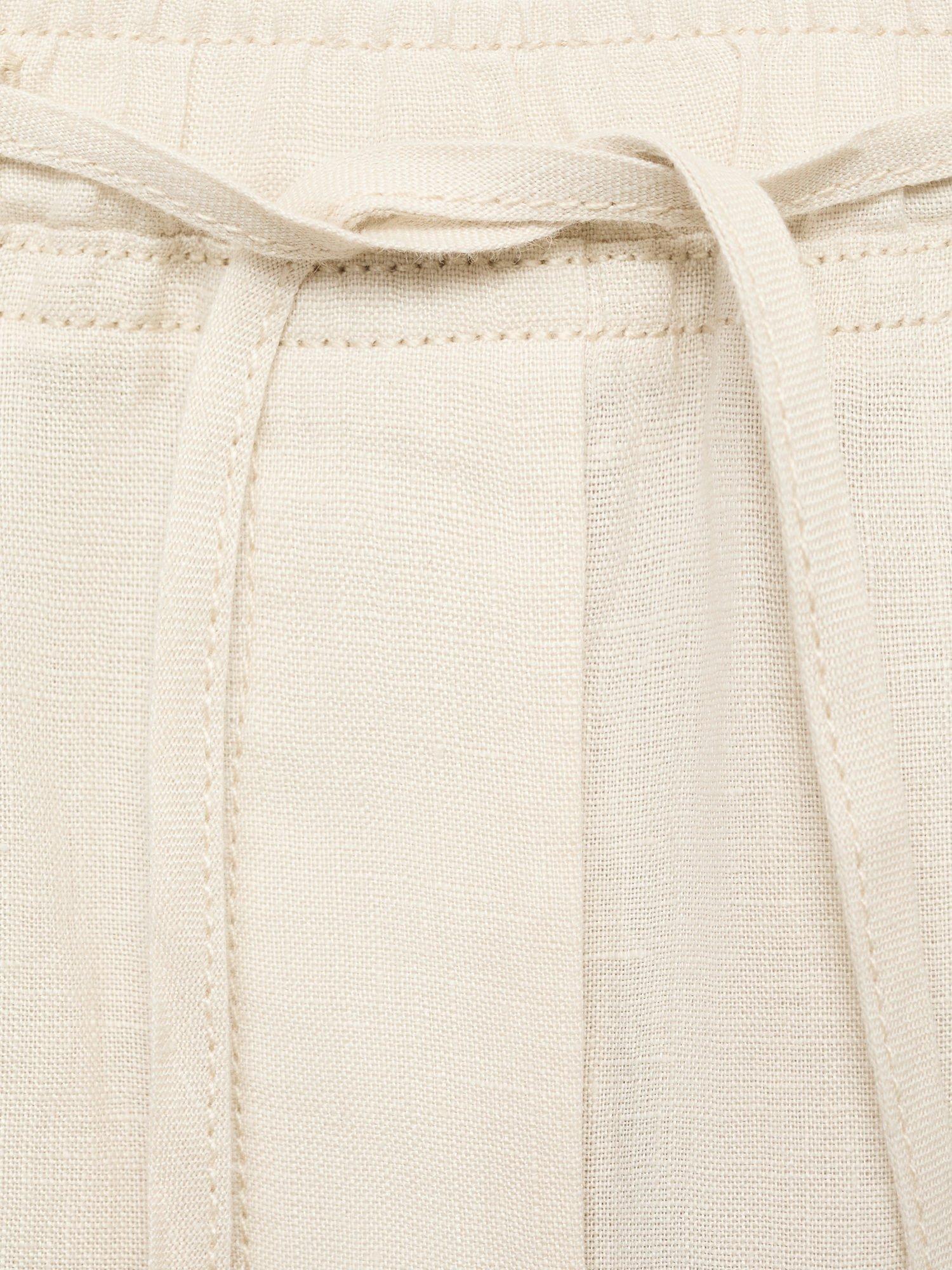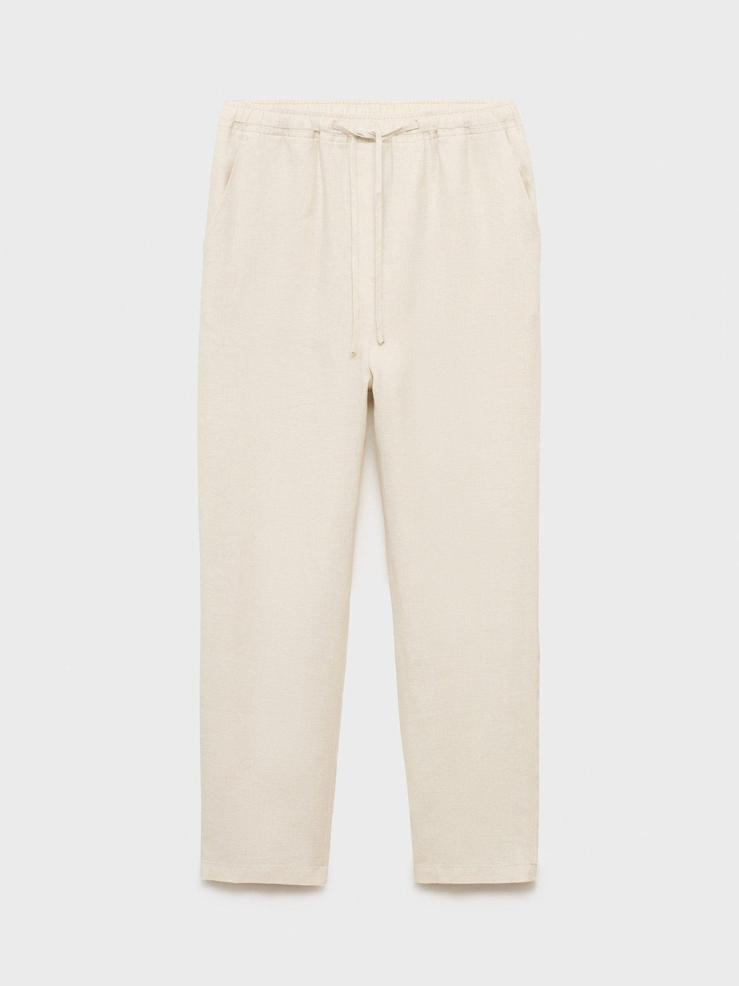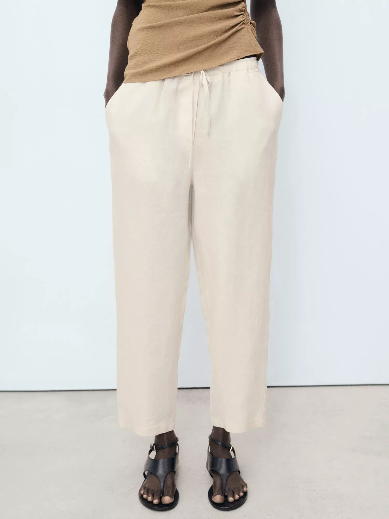 A pair of tapered trousers from Mango, with a linen base. This style is cut to sit mid rise with a drawstring waist and hems that hit just at the ankle.