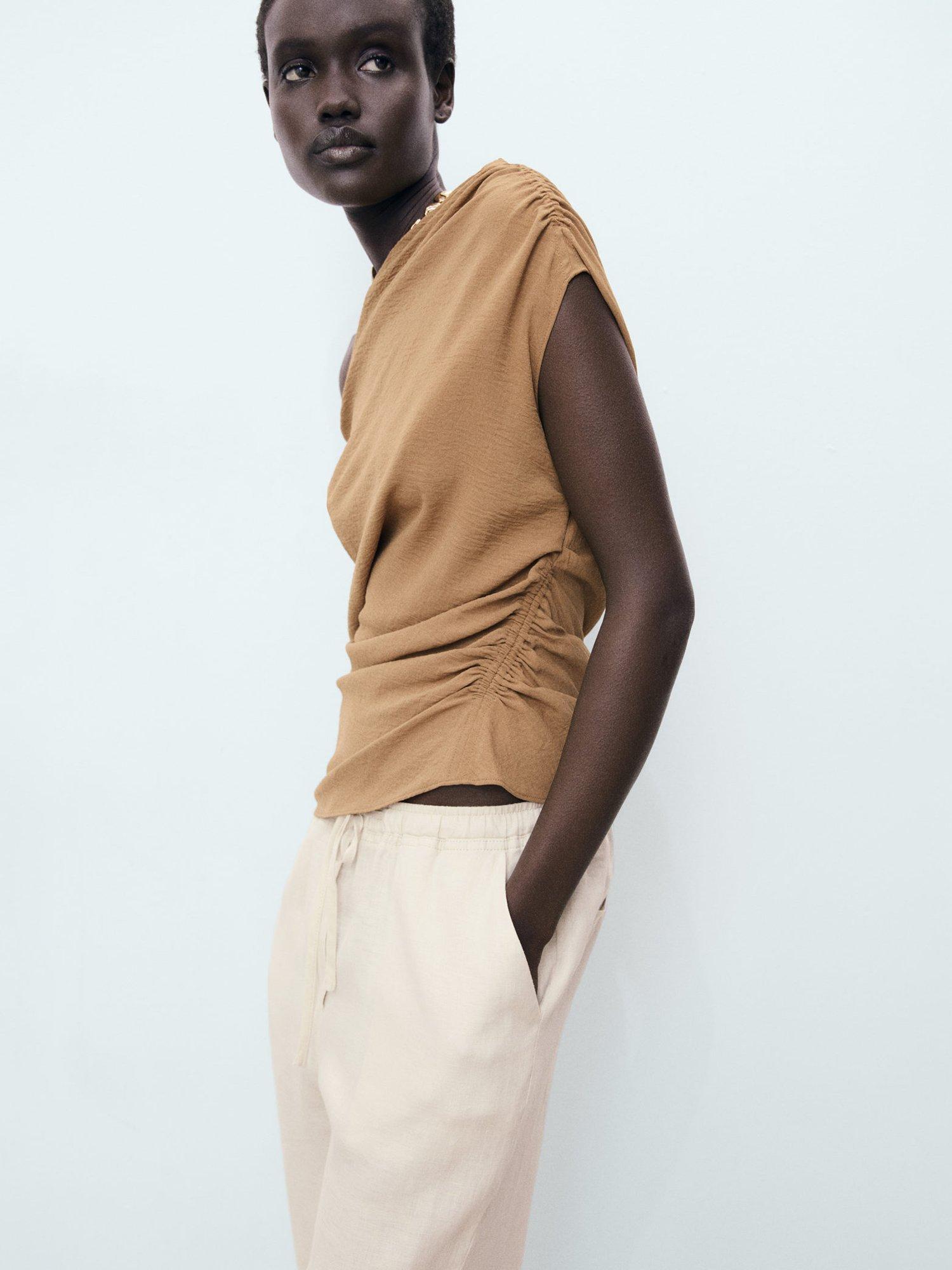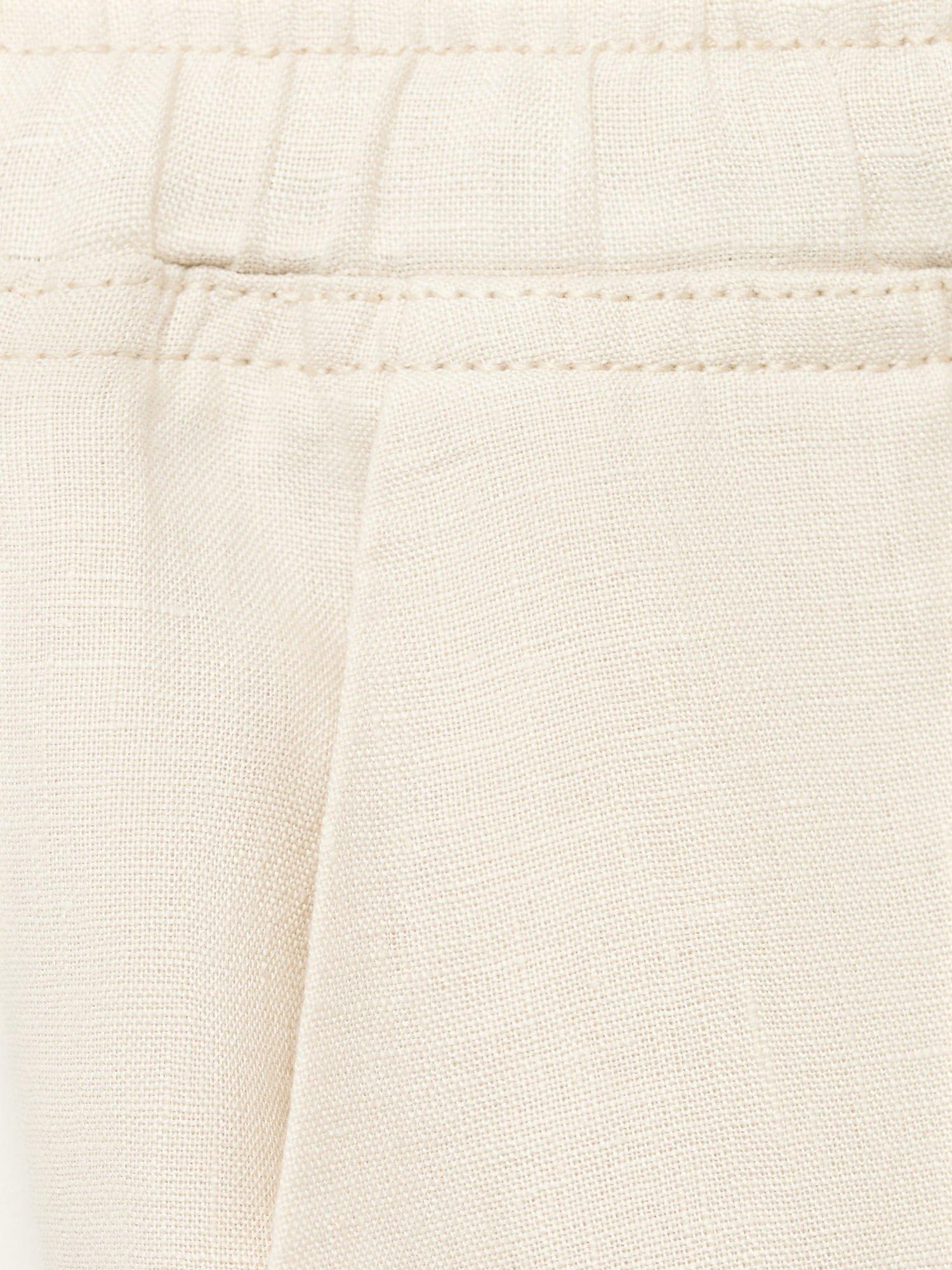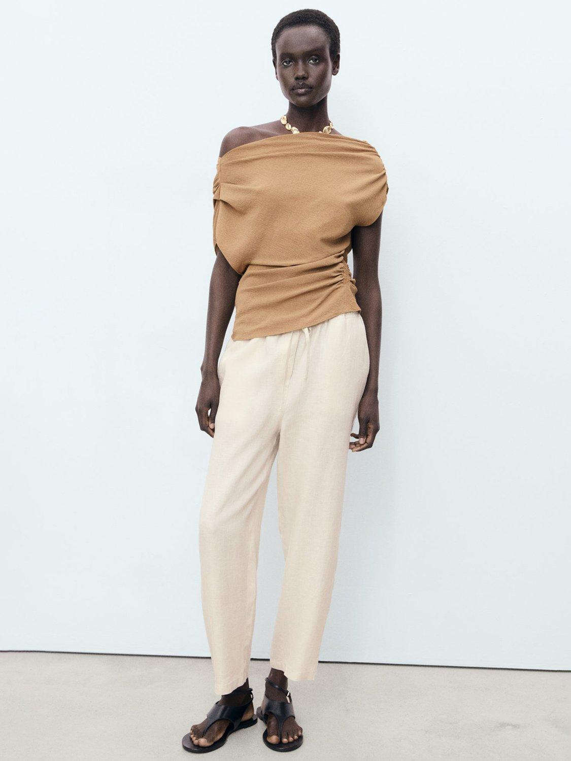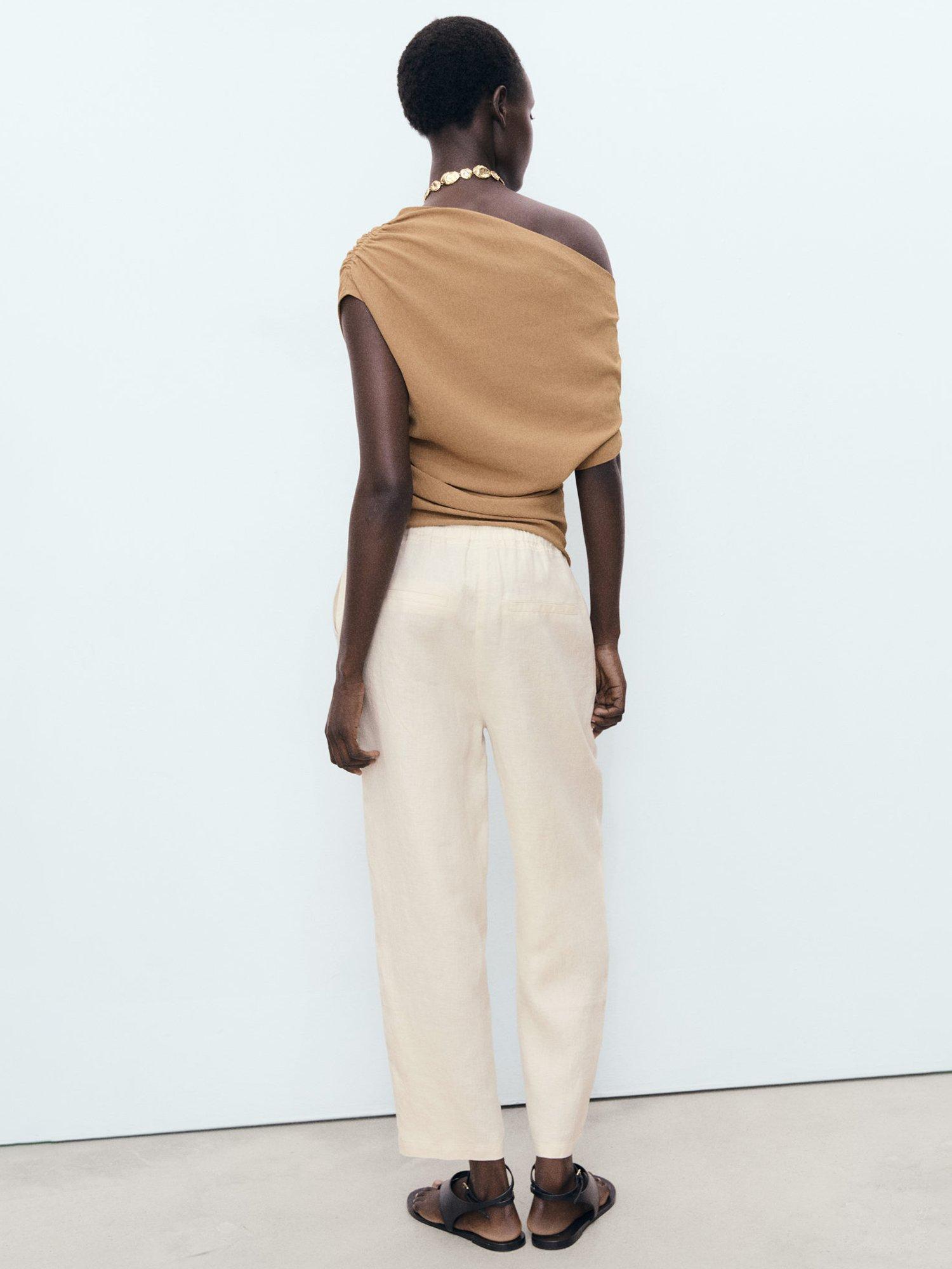 A pair of tapered trousers from Mango, with a linen base. This style is cut to sit mid rise with a drawstring waist and hems that hit just at the ankle.