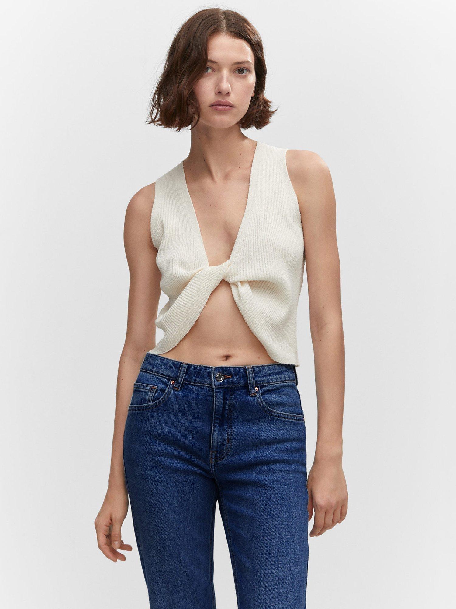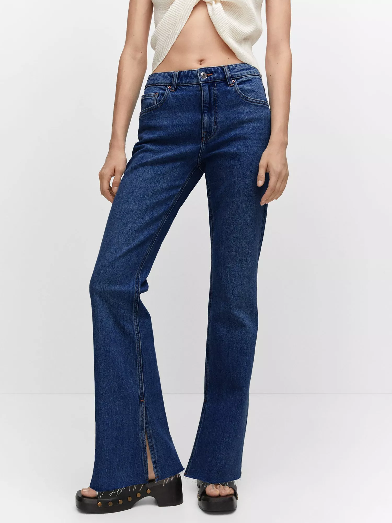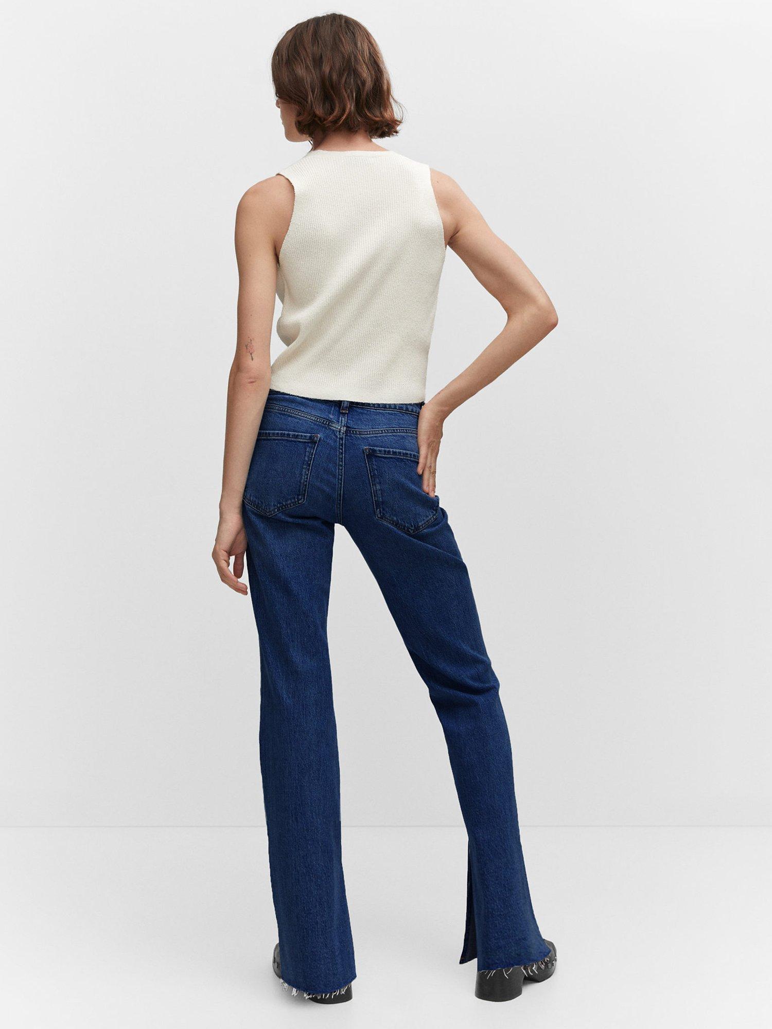 Inspired by flared silhouettes of the 70s, these mid rise jeans by Mango offer a timeless choice in cotton blended denim and fall to a regular split frayed hems.