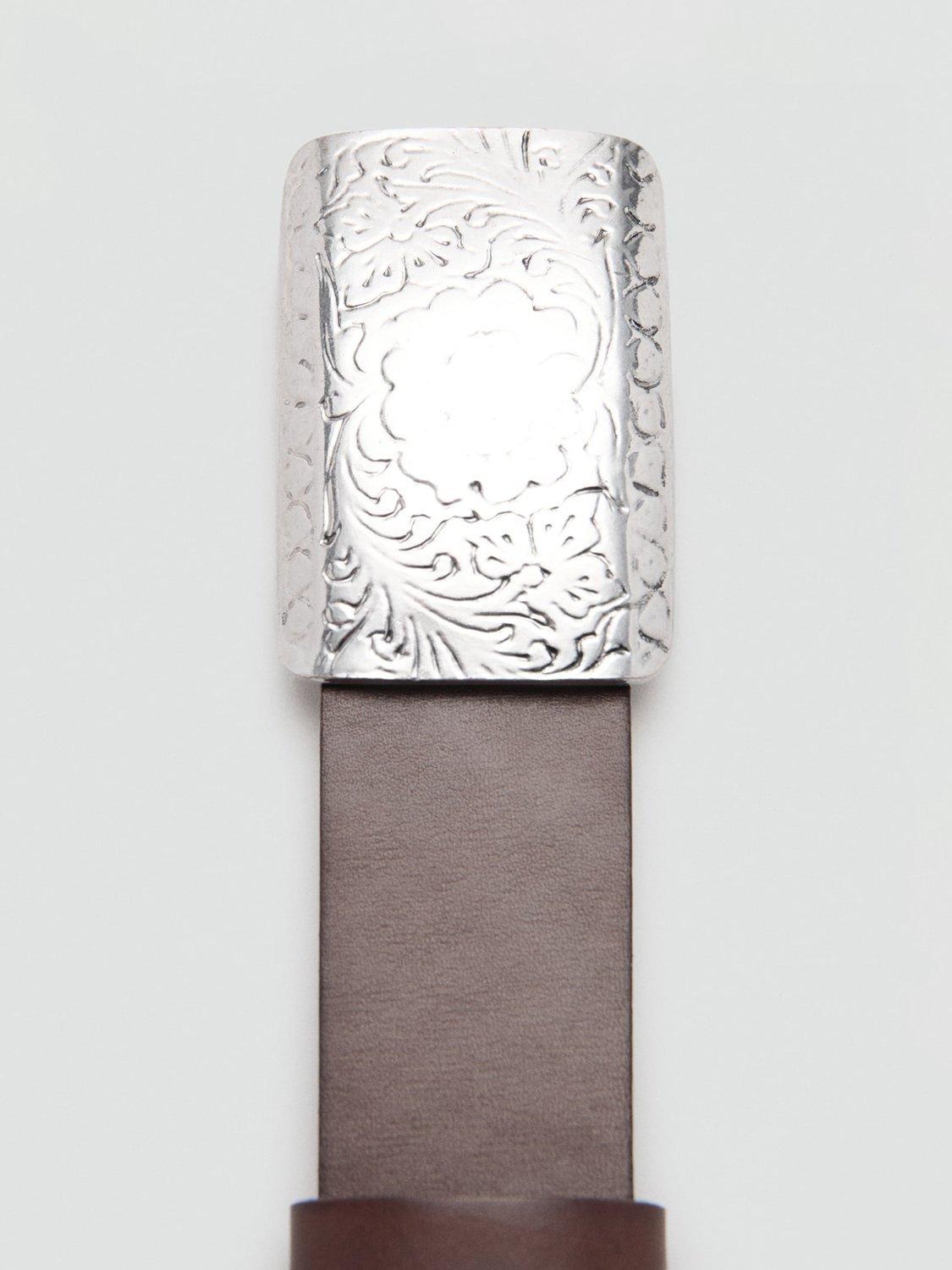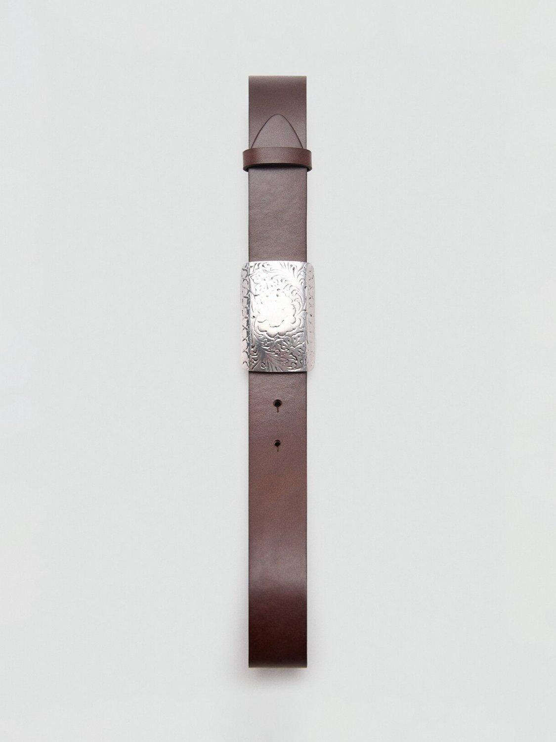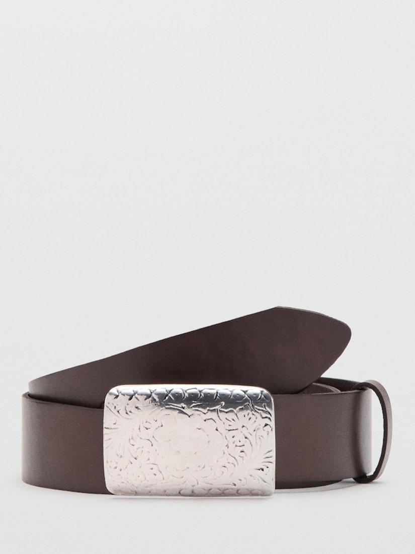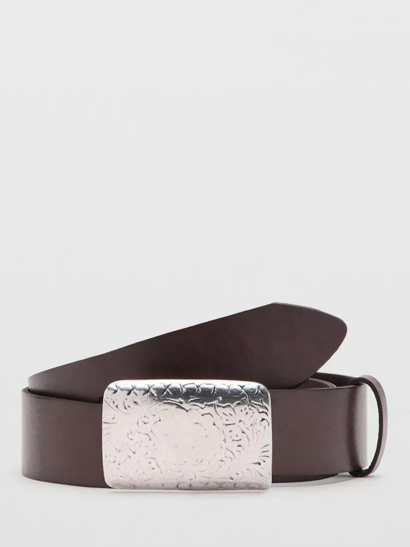 A leather belt by Mango designed with an engraved silver-toned buckle.