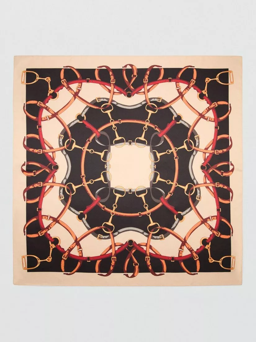 This equestrian motif patterned square scarf adds character to your outfit. Easy to style in multiple ways.