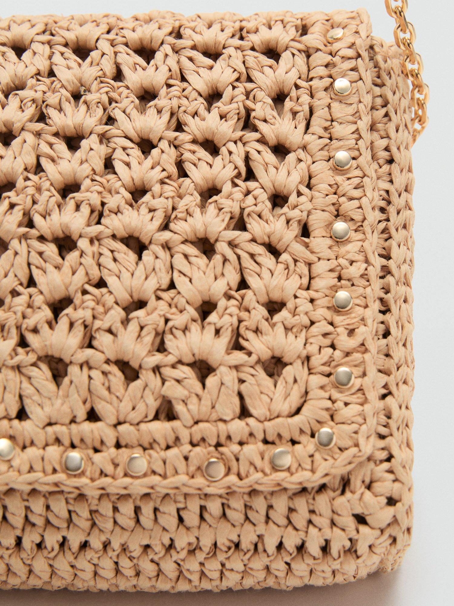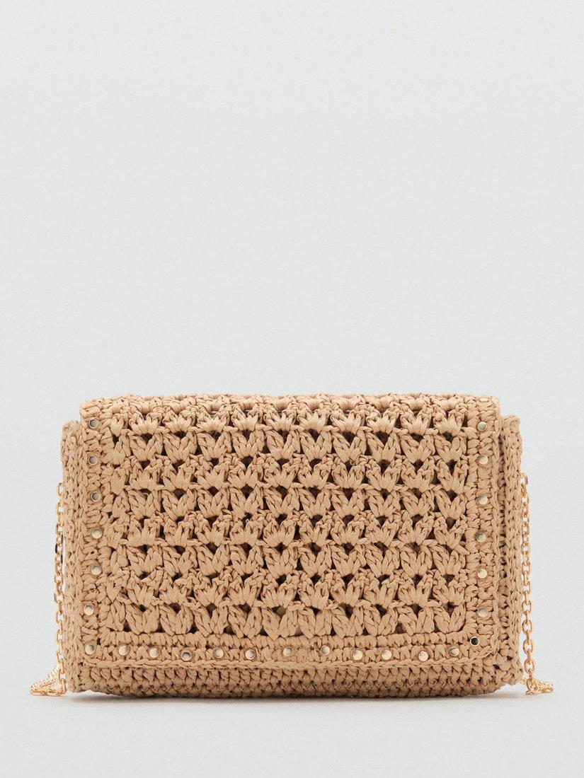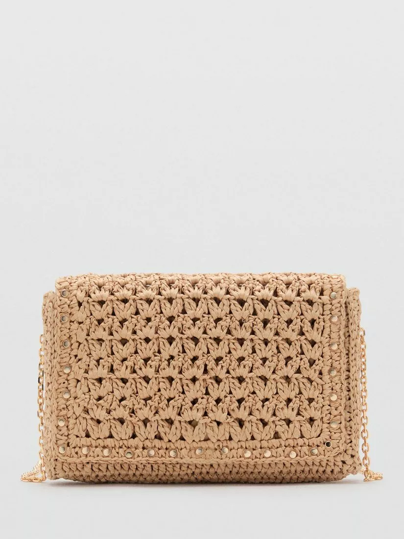 This woven flapover crossbody bag from Mango features a studded outer, adjustable strap and magnet fastening.