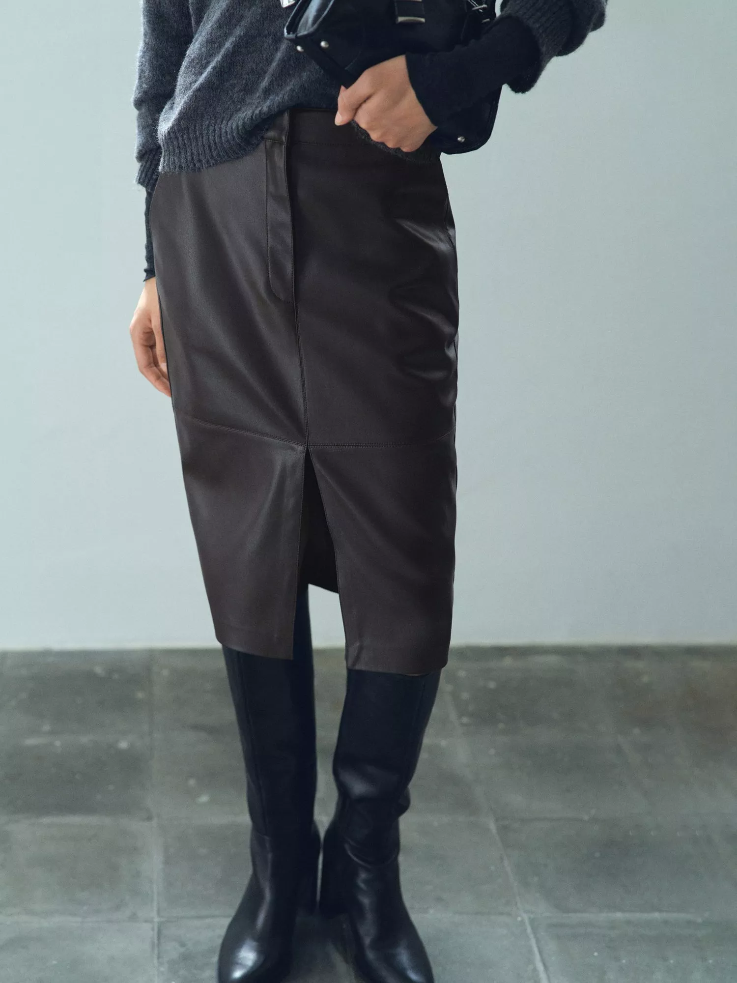 Slim cut with quiet precision to a pencil shape, this knee-length skirt from Mango is made from smooth faux leather and fastens smoothly with a zip.