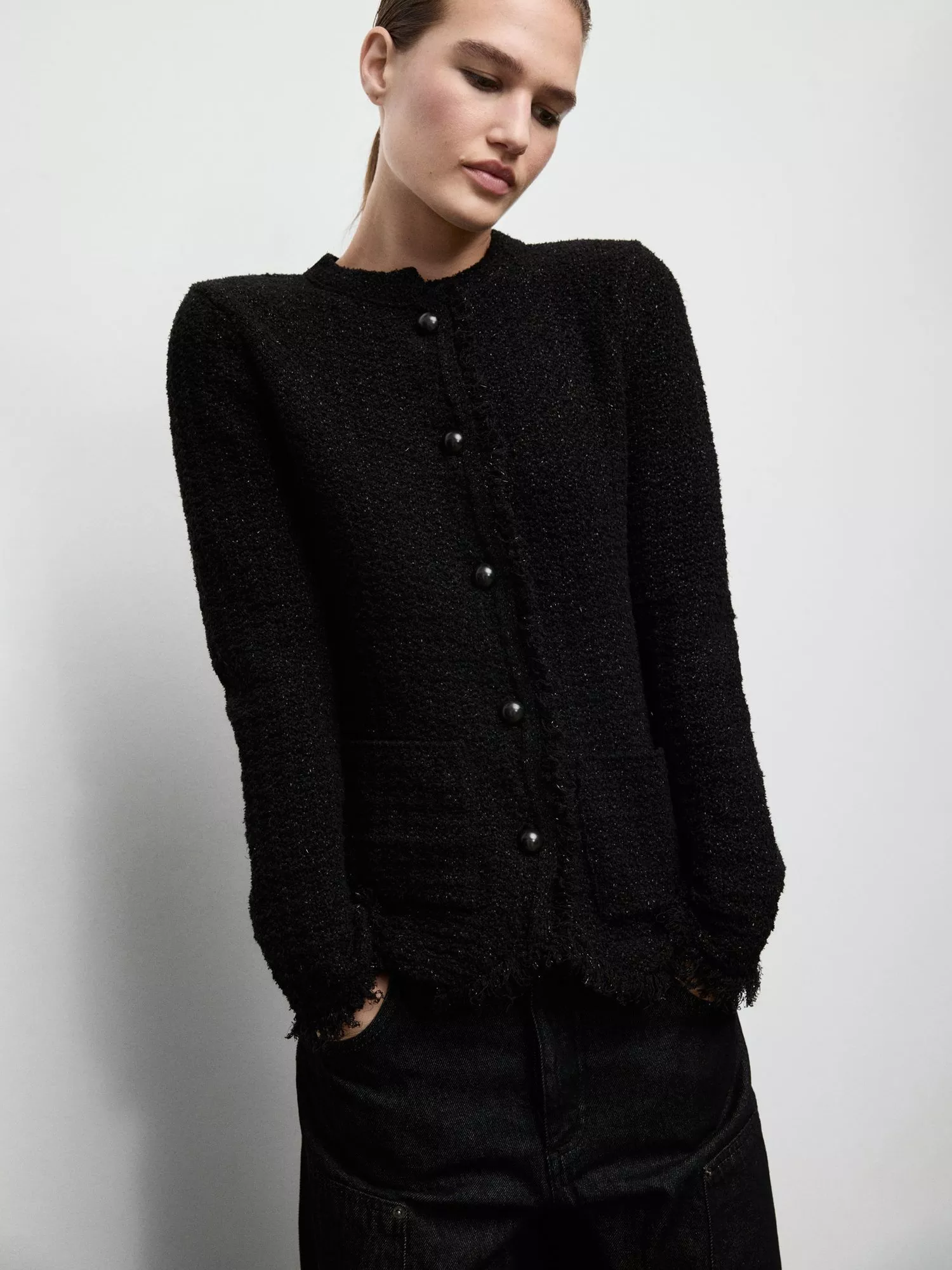 This cardigan keeps you comfortable while letting your personality shine, thanks to clever metallic finish, classic crew neck and fringed cuffs. Layer it with ease for work or weekends.