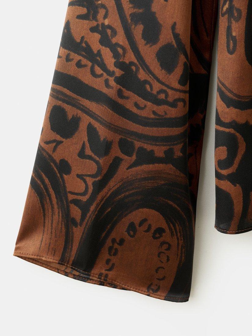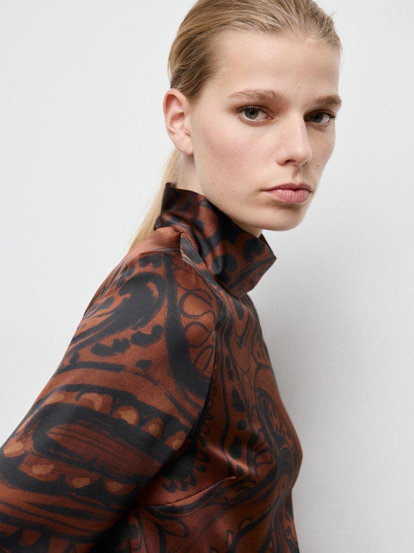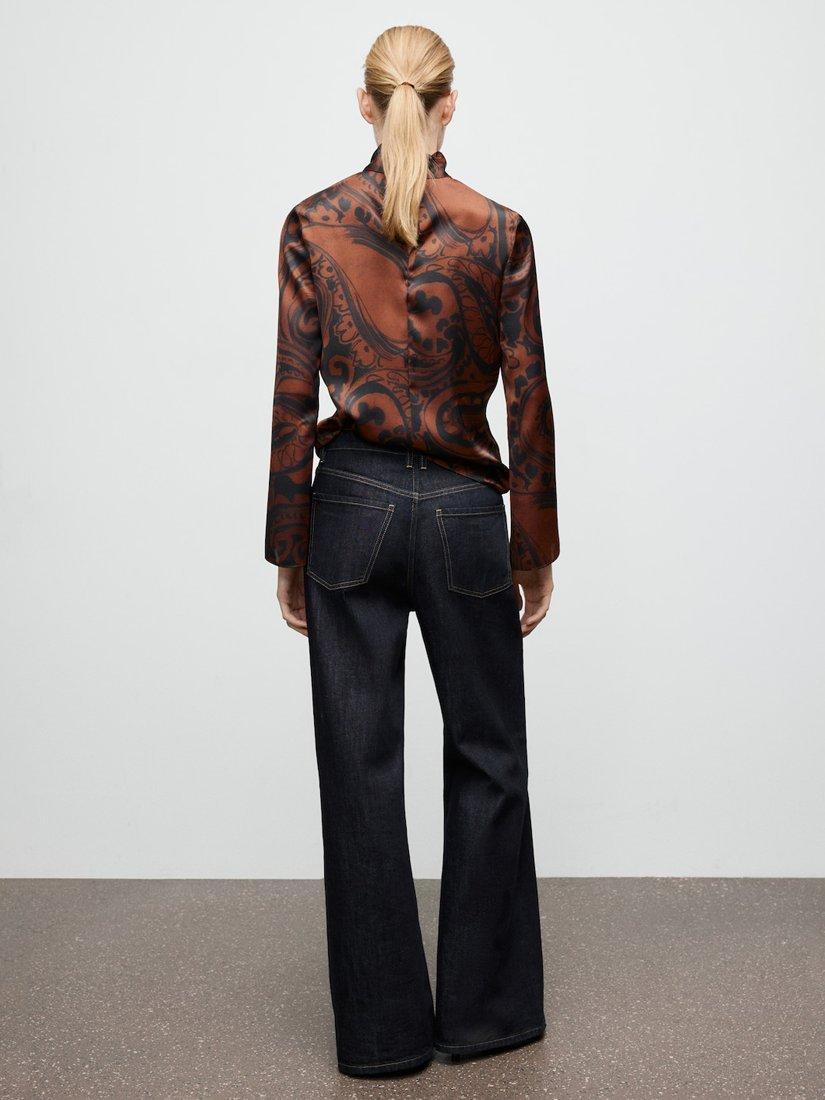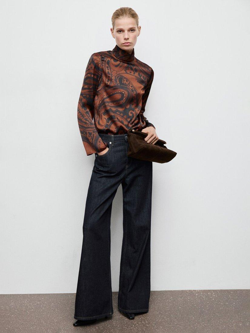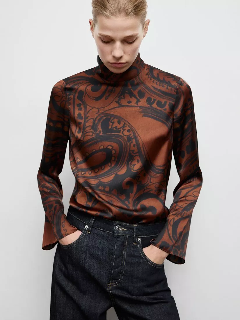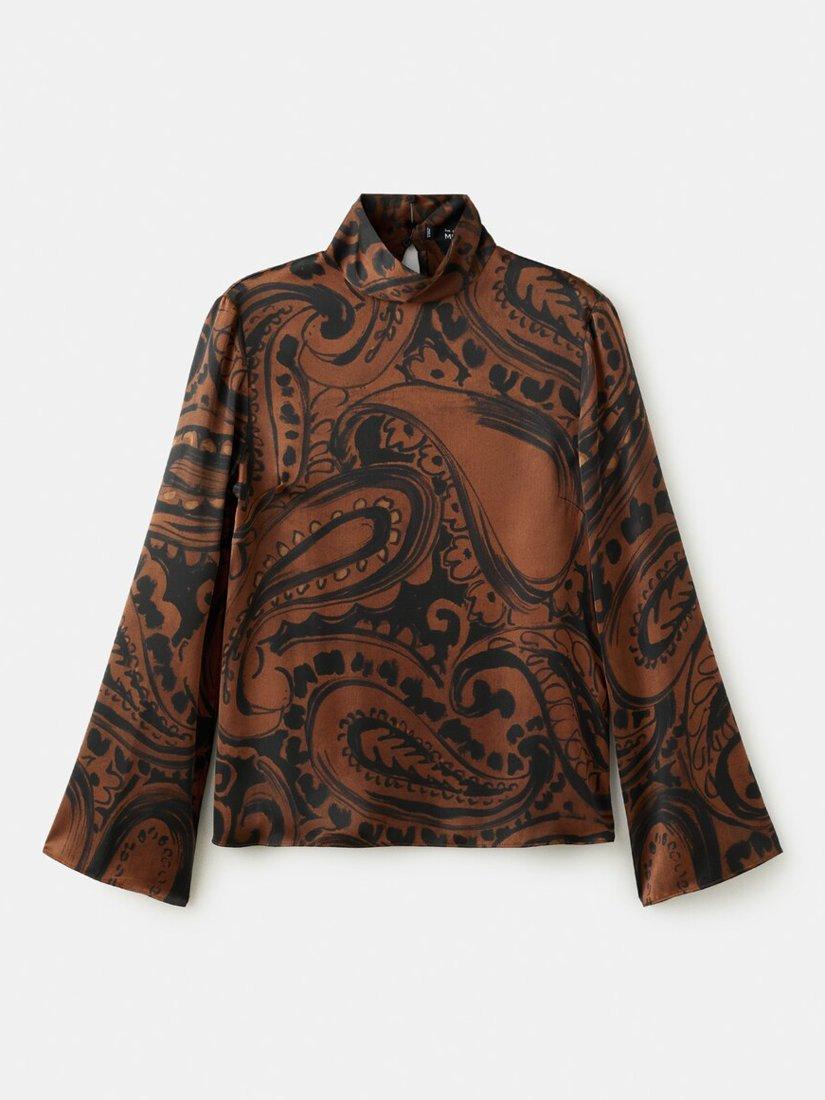 A silky sheen blouse from Mango. With a sculpted funnel neck and long bell sleeves, it's enriched with striking paisley swirls. Perfectly polished for occasions filled with fun.