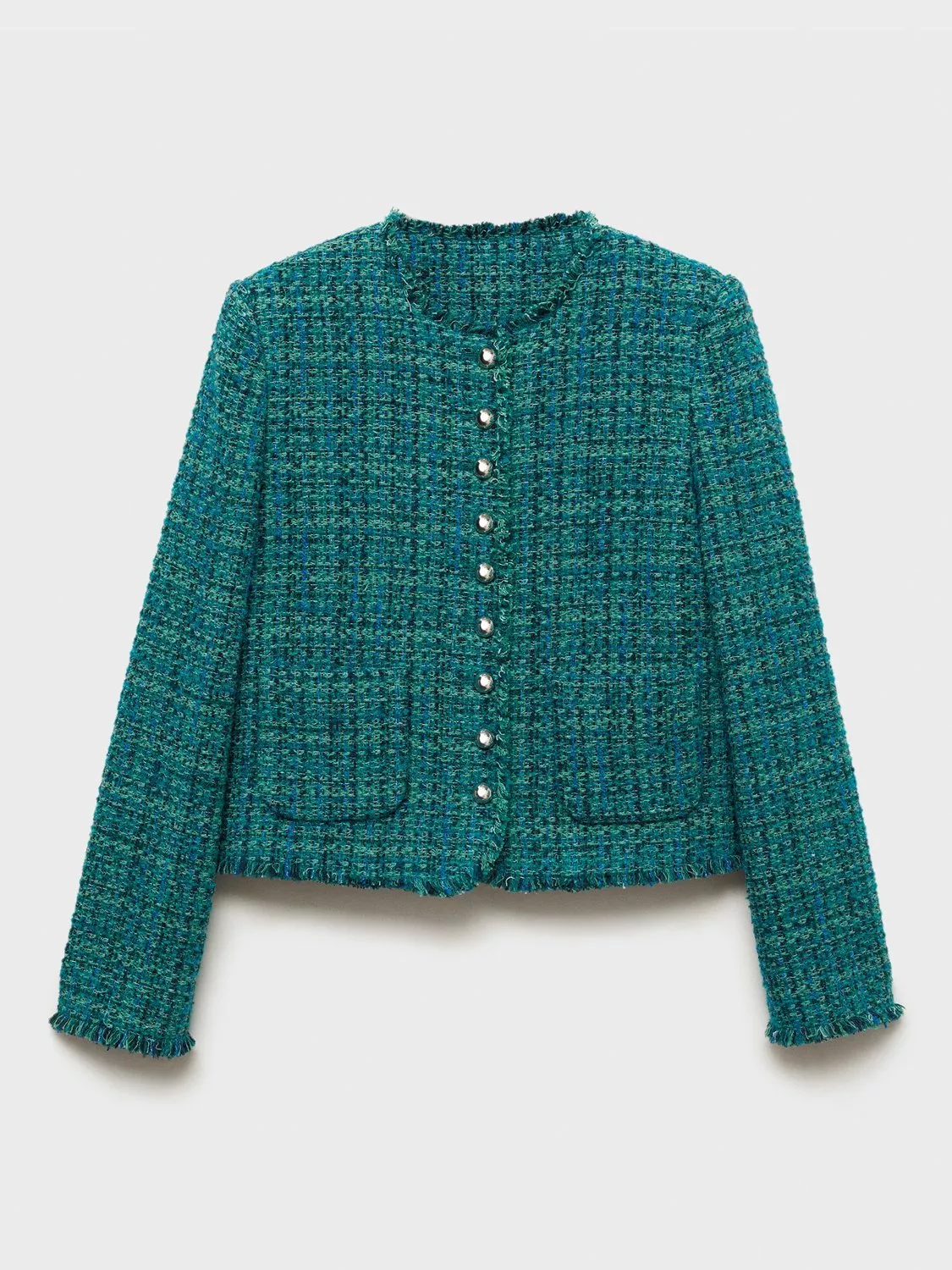 Ideal for transitioning between the season, this textured check jacket from Mango is designed with a simple round neckline, frayed trims and is crafted from a cotton blend.