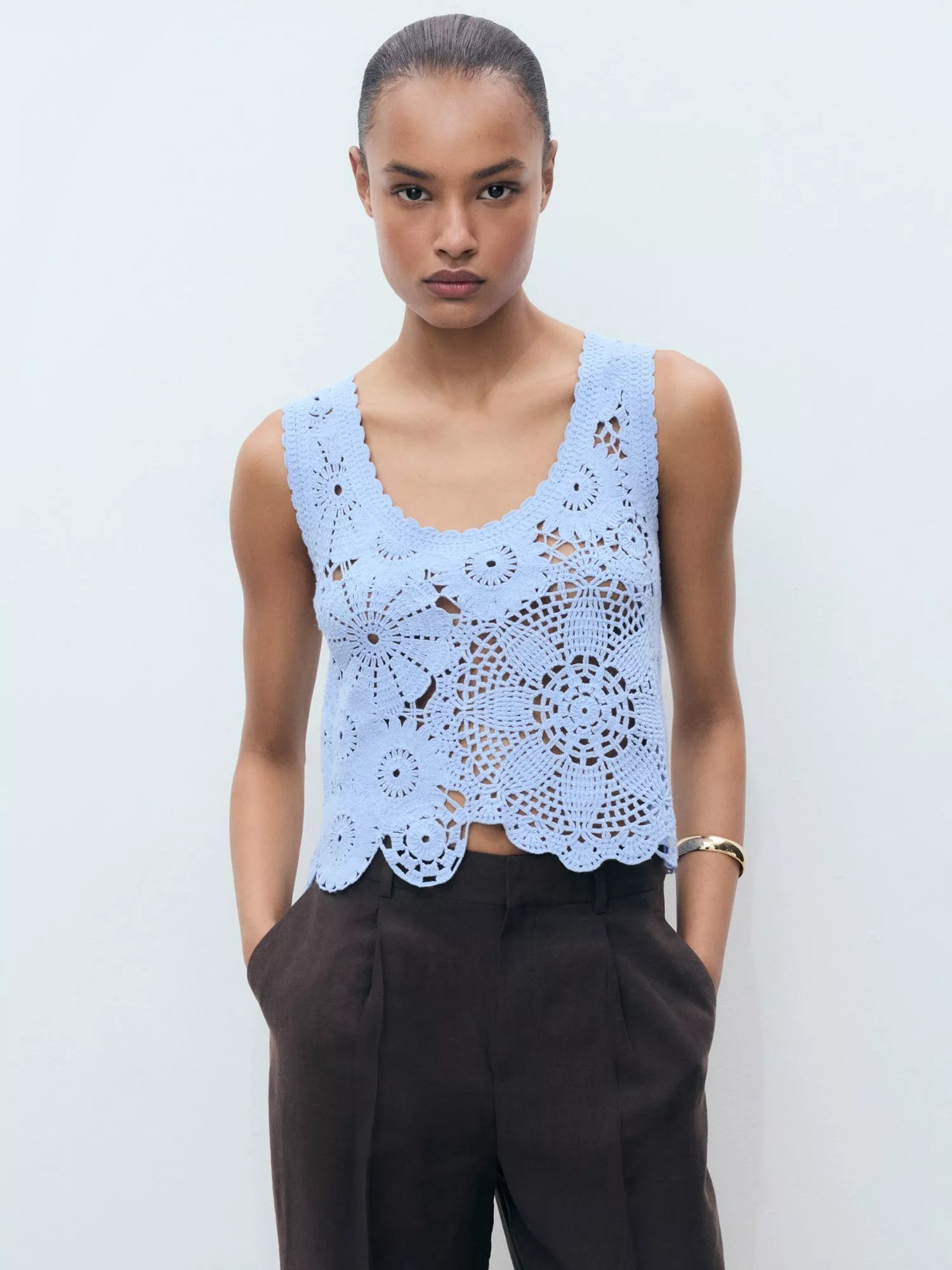 This cotton blend crochet top keeps you comfortable with medium-weight warmth. Embroidered floral details and a scoop neck add a clever twist, making it easy to mix into your wardrobe for work or weekends.