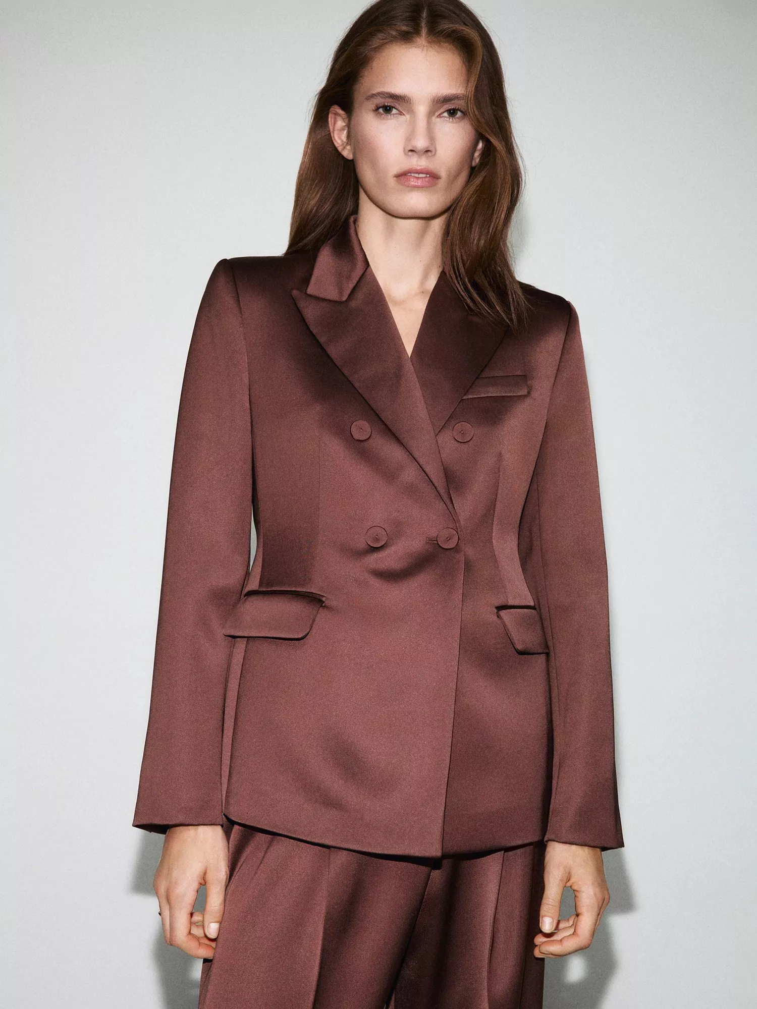 A double-breasted blazer by Mango, made in smooth satin. Sharp V-neck and lining keep you confident and comfortable, while clever button fastening makes every outing easier.