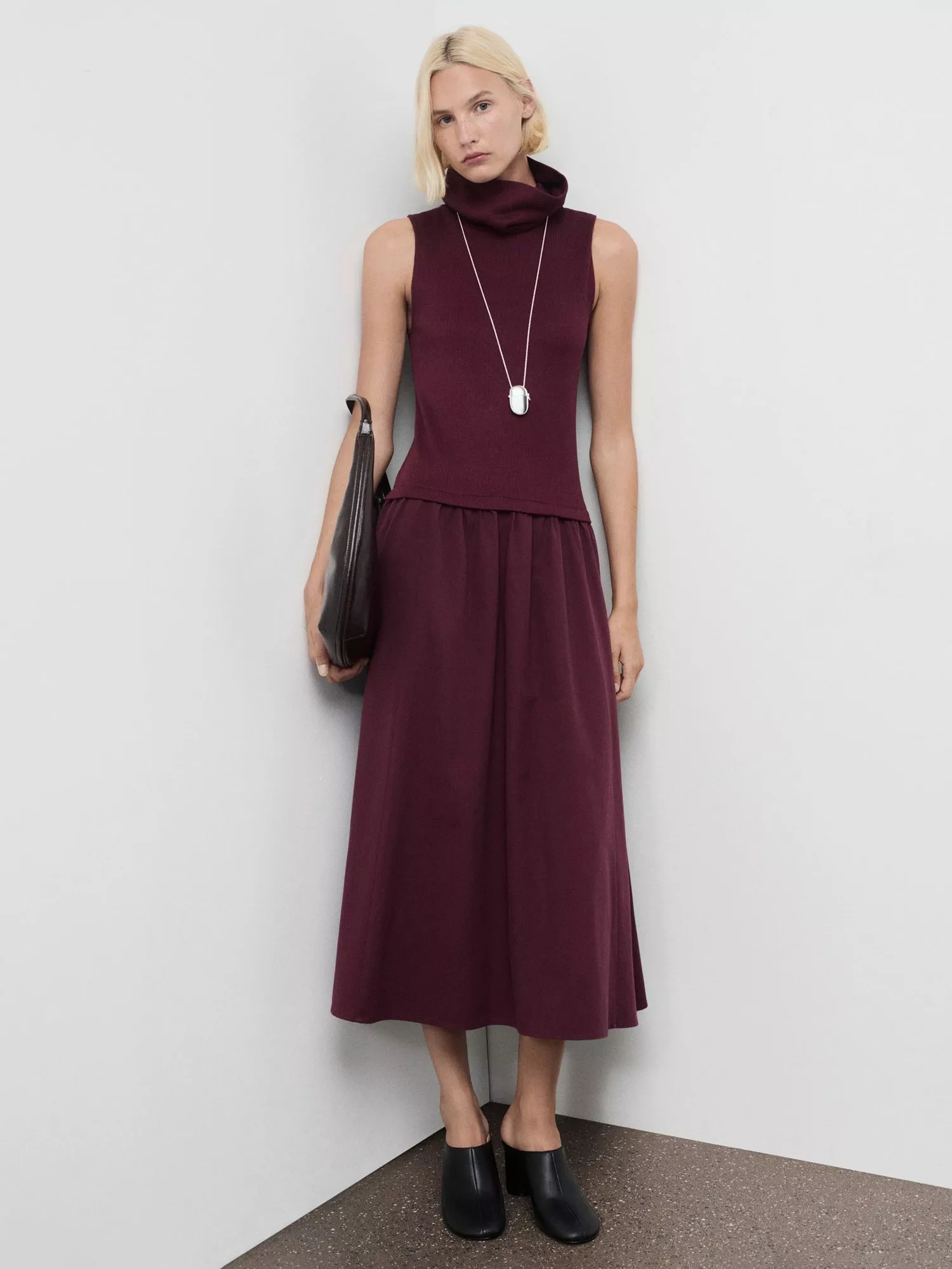 A fit and flare midi dress, designed for all-day comfort with a draped roll neck and sleeveless style. The pleated skirt moves as you do, making it ideal for lively lunches or quiet strolls.