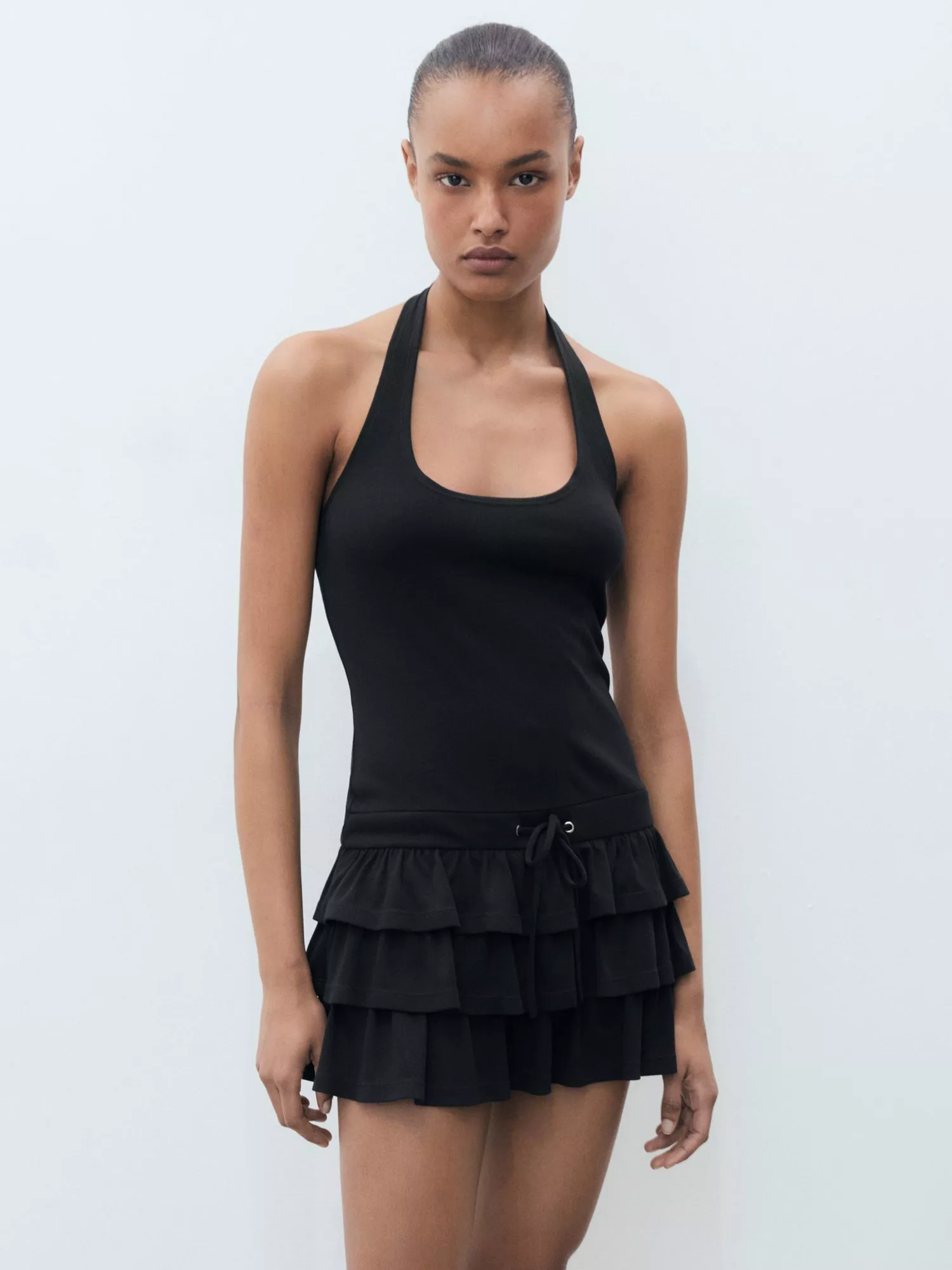 This sleeveless mini dress by Mango has a halter neckline and pretty ruffles for added movement.