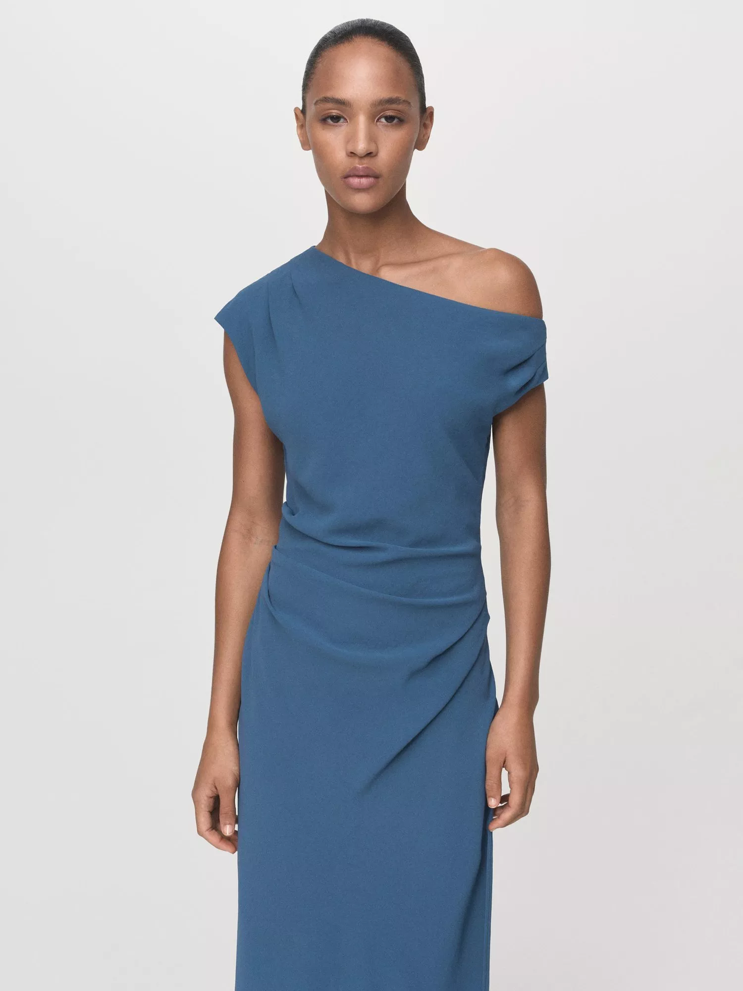 A ruched midi dress from Mango. Its off-shoulder, asymmetric cut offers a unique look that moves easily with you, making you feel comfortable and confident.