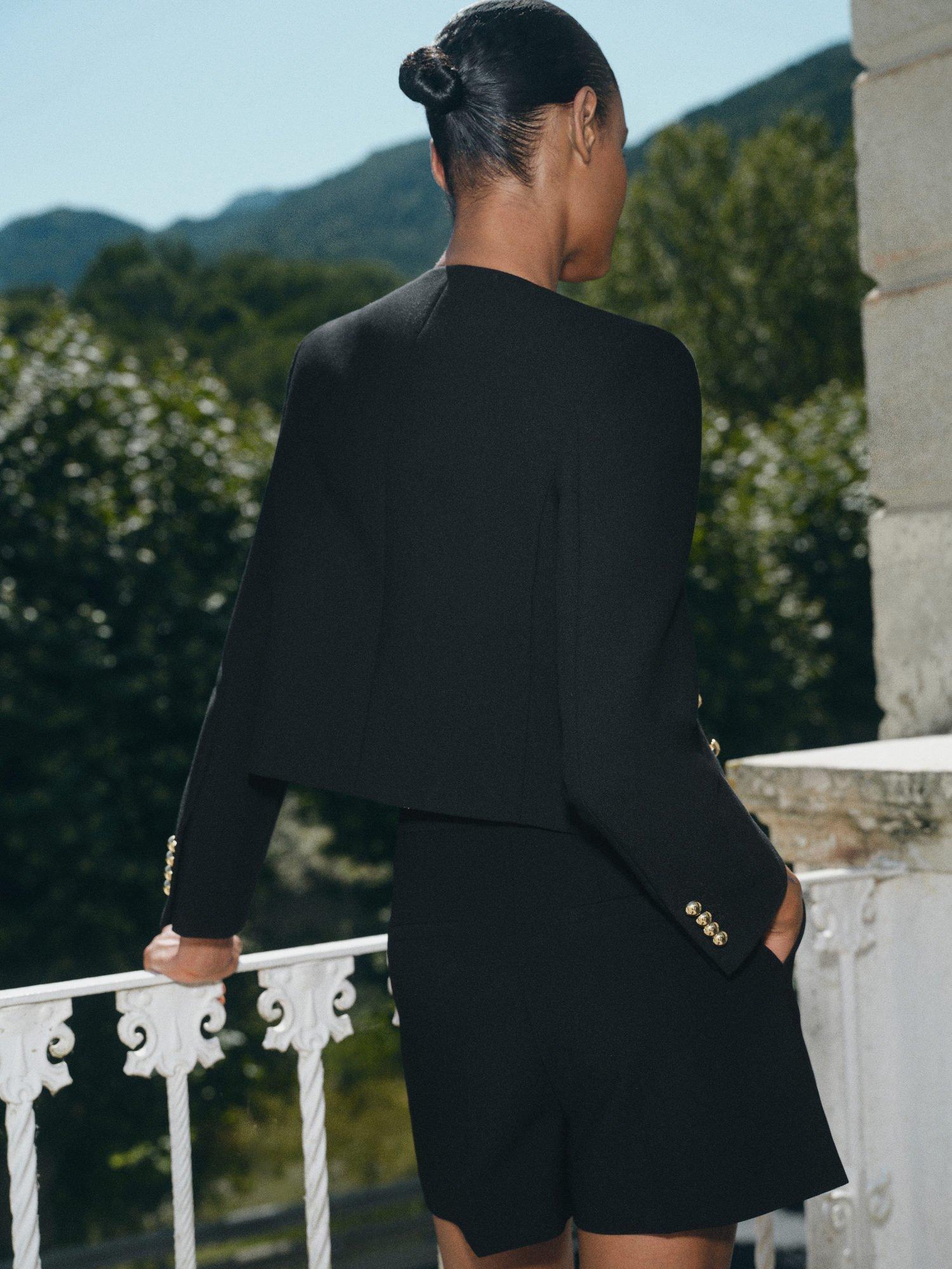 A sharp cropped blazer. Its regular fit and long sleeves give you flexibility and style, while the crew neck and plain pattern keep things smart. Ideal for pairing with your favourite looks.