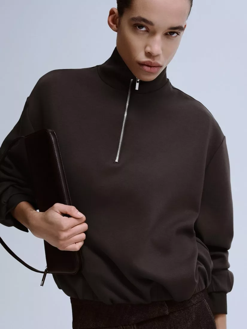 A half zip pullover with a cropped silhouette, plush hand feel and voluminous sleeves, made for city days and relaxed weekends.