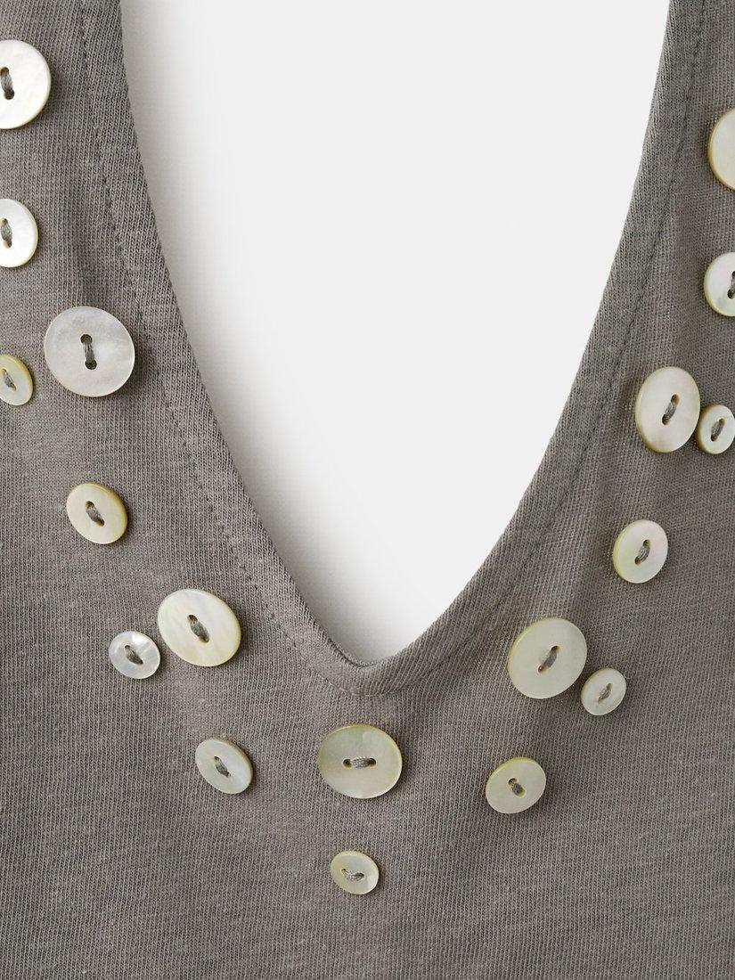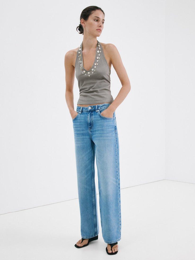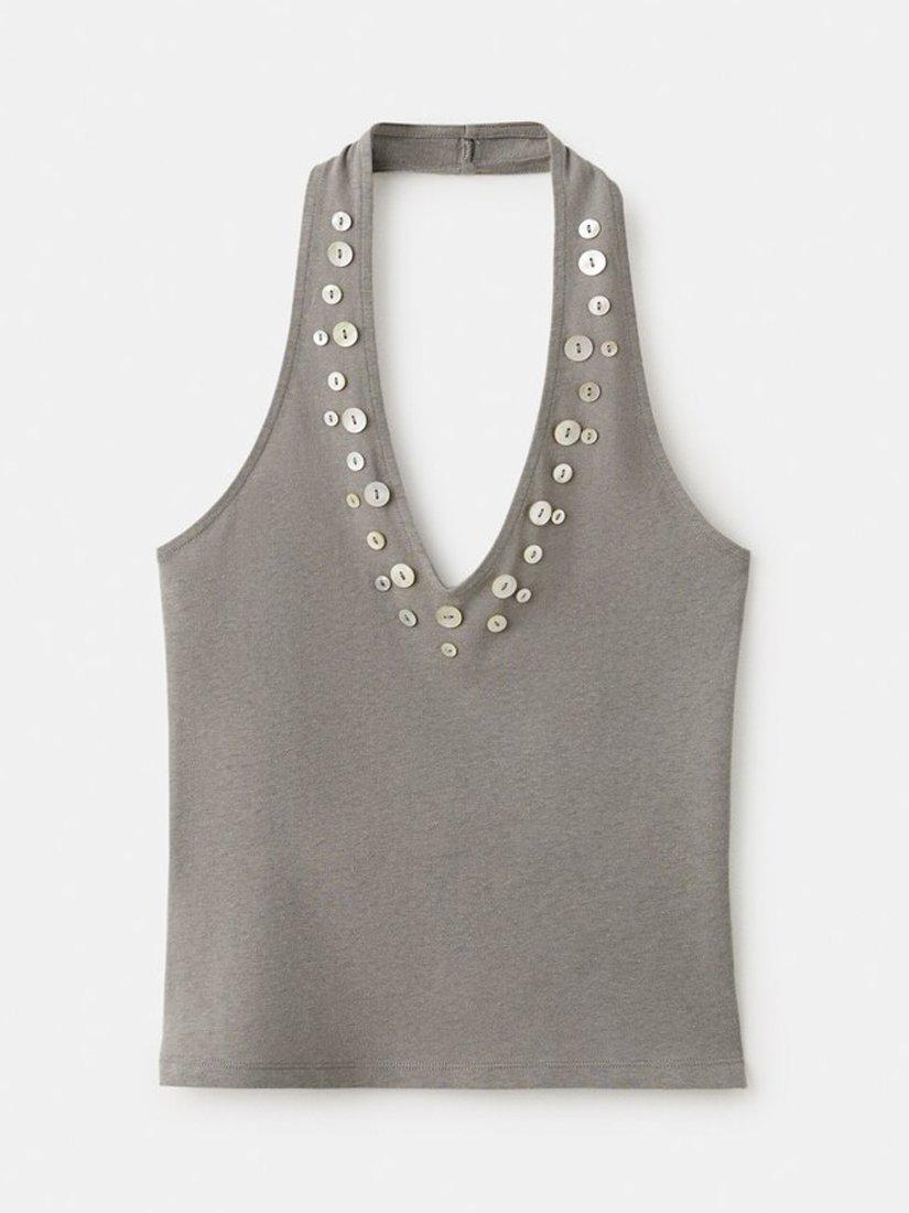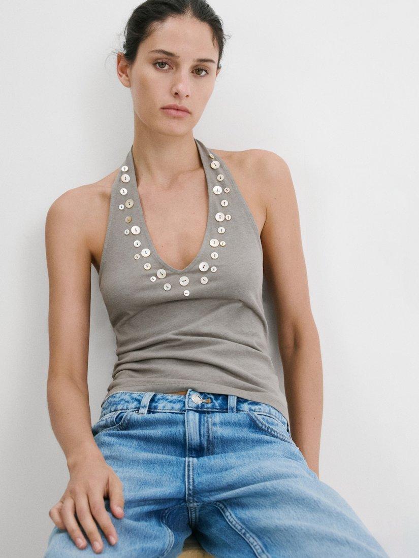Lightweight and breathable, this sleeveless halterneck tank from Mango pairs a soft cotton-linen blend with iridescent button embellishment for added flair. An easy choice for daytime plans.