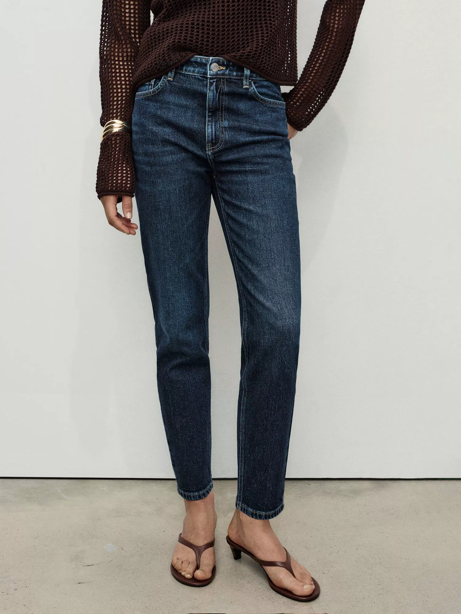 A pair of tapered mom jeans by Mango. Made in soft denim with a mid rise and a zip fastening, they are cropped at the ankle.