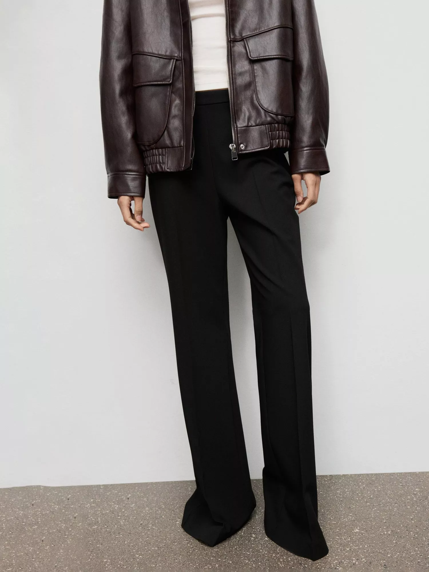 A pair of bold sweeping flared trousers from Mango. This style is cut to sit mid rise with a zip fastening and longer length hems.