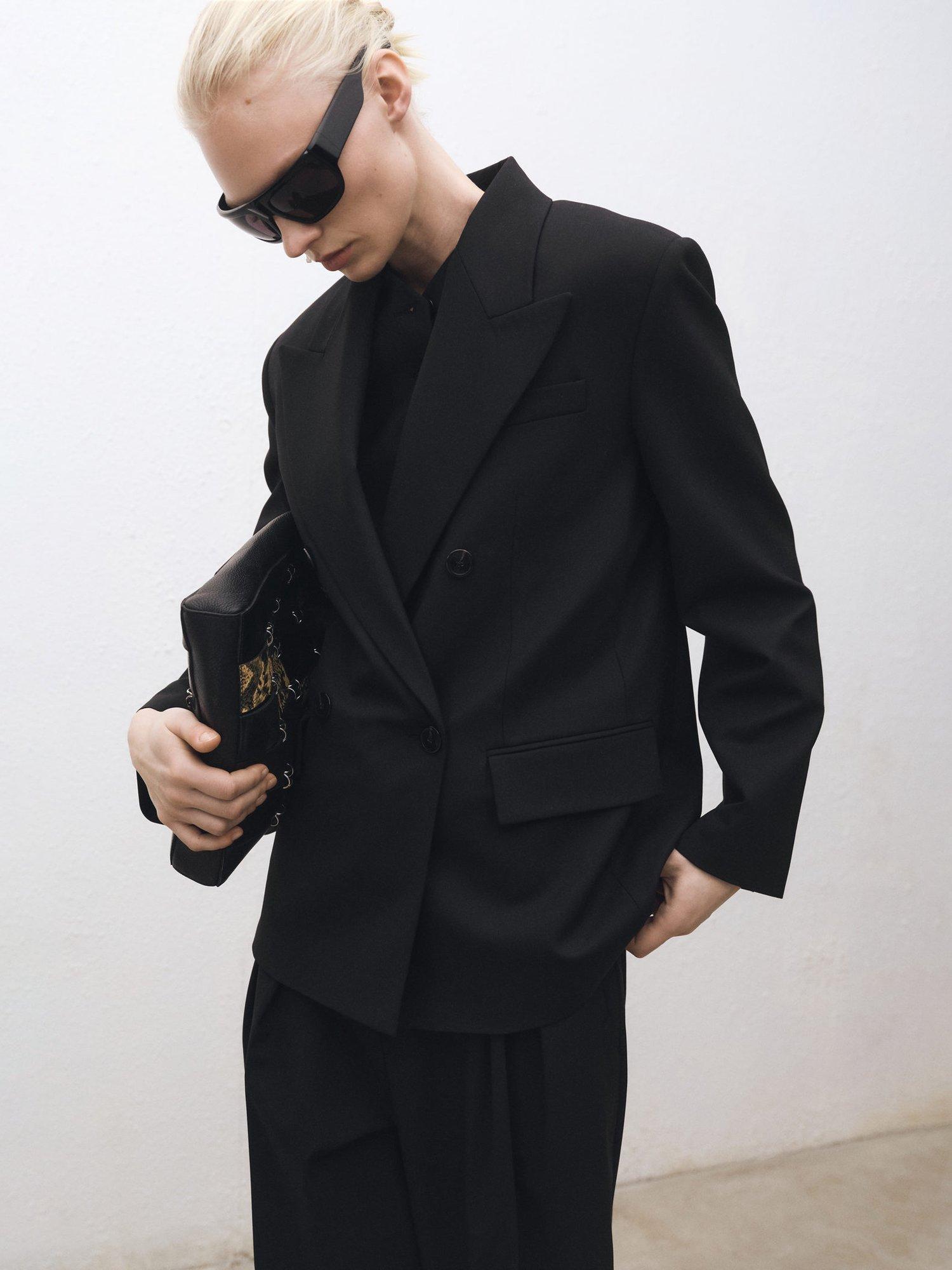 - 54% polyester, 41% wool, 5% elastane. Lining: 52% viscose, 48% polyester