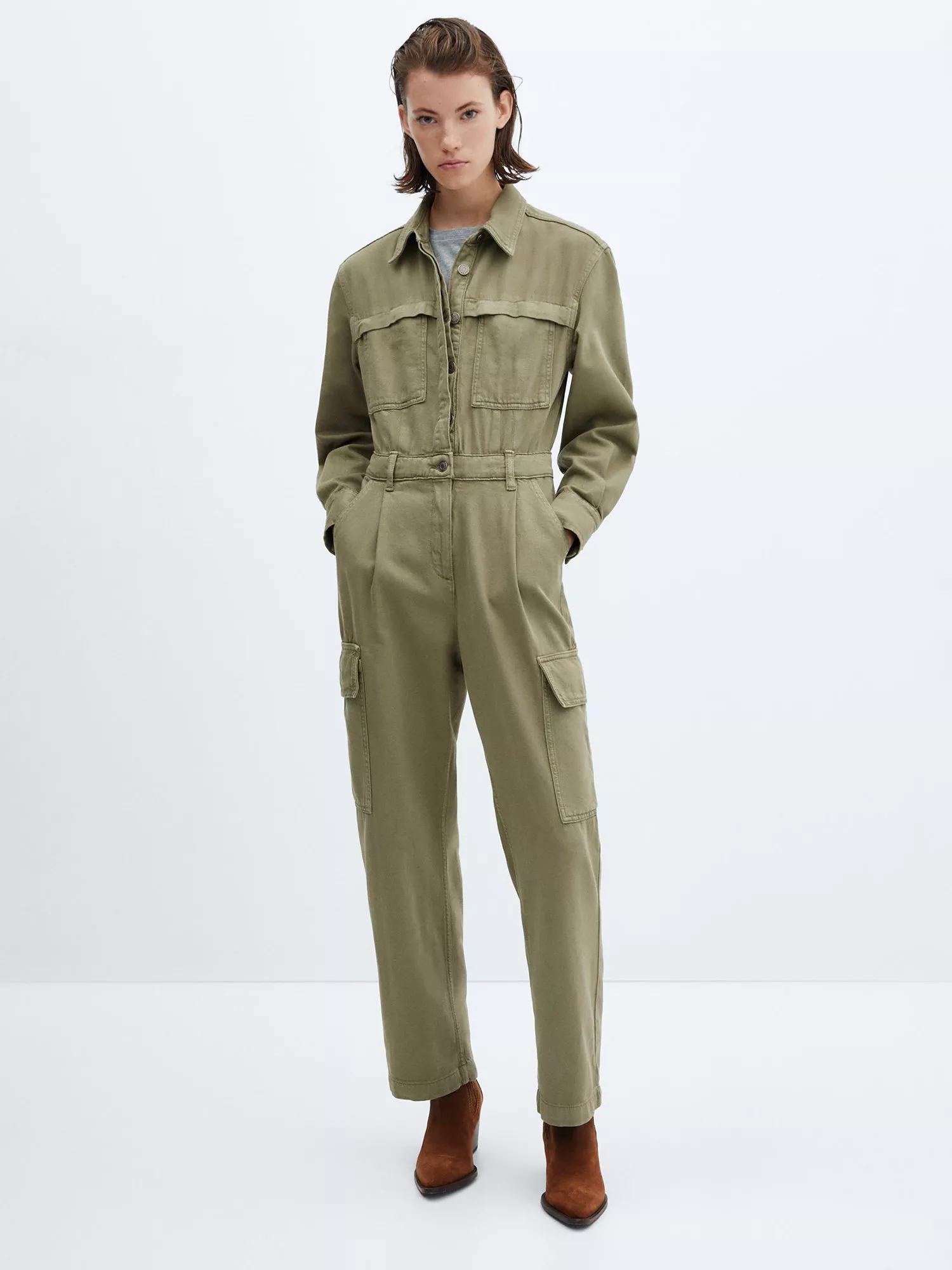 Topped with a neat collar and long sleeves, this jumpsuit by Mango falls to a straight leg silhouette and is made to last thanks to its denim construction.