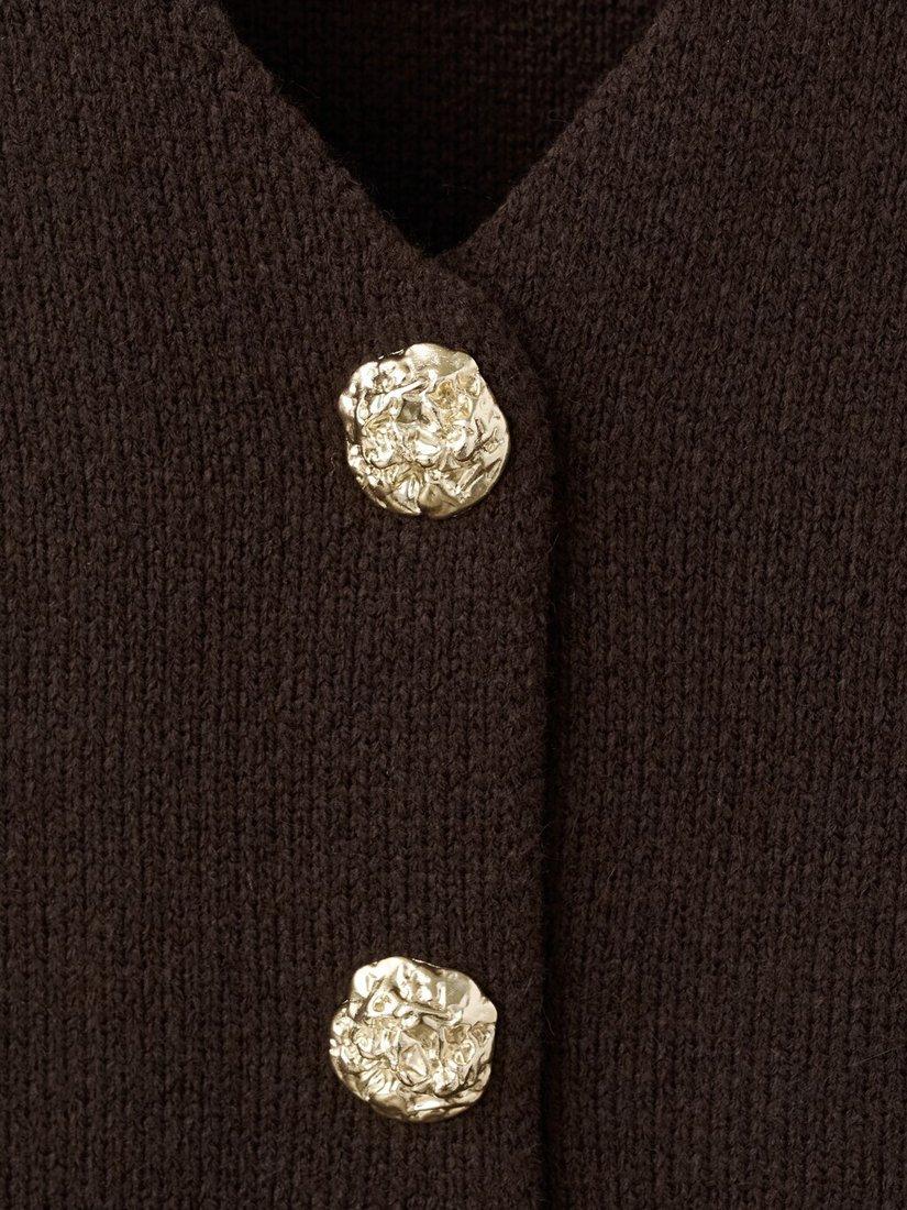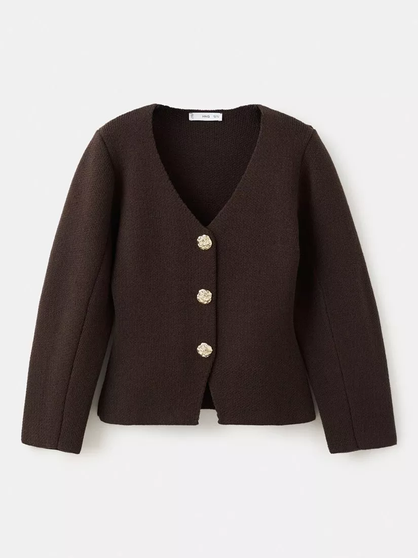 A single-breasted knit jacket by Mango, with long sleeves and a V-neck design blending smart style with comfort. Ideal for wedding guests or evening occasions, it's finished with with statement metal buttons.