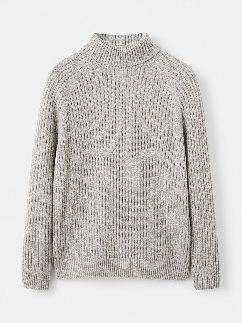 A cable knit roll neck jumper. The textured design adds subtle interest, while the wool blend keeps you warm. Perfect for layering or wearing solo.