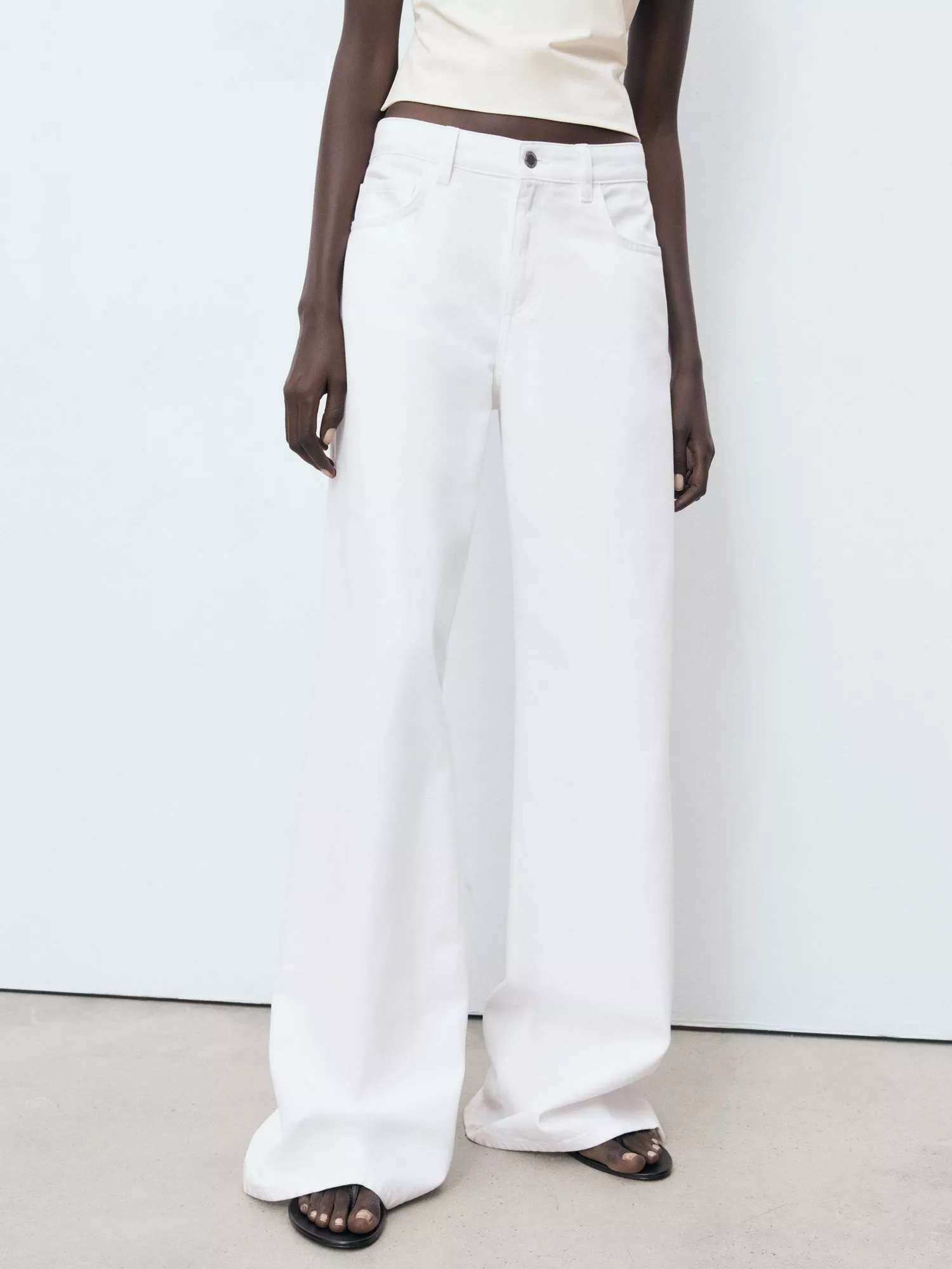A pair of characteristically wide legged jeans from Mango. Made from pure cotton featuring a low rise and a classic zip and button fly, they fall to a full-length.