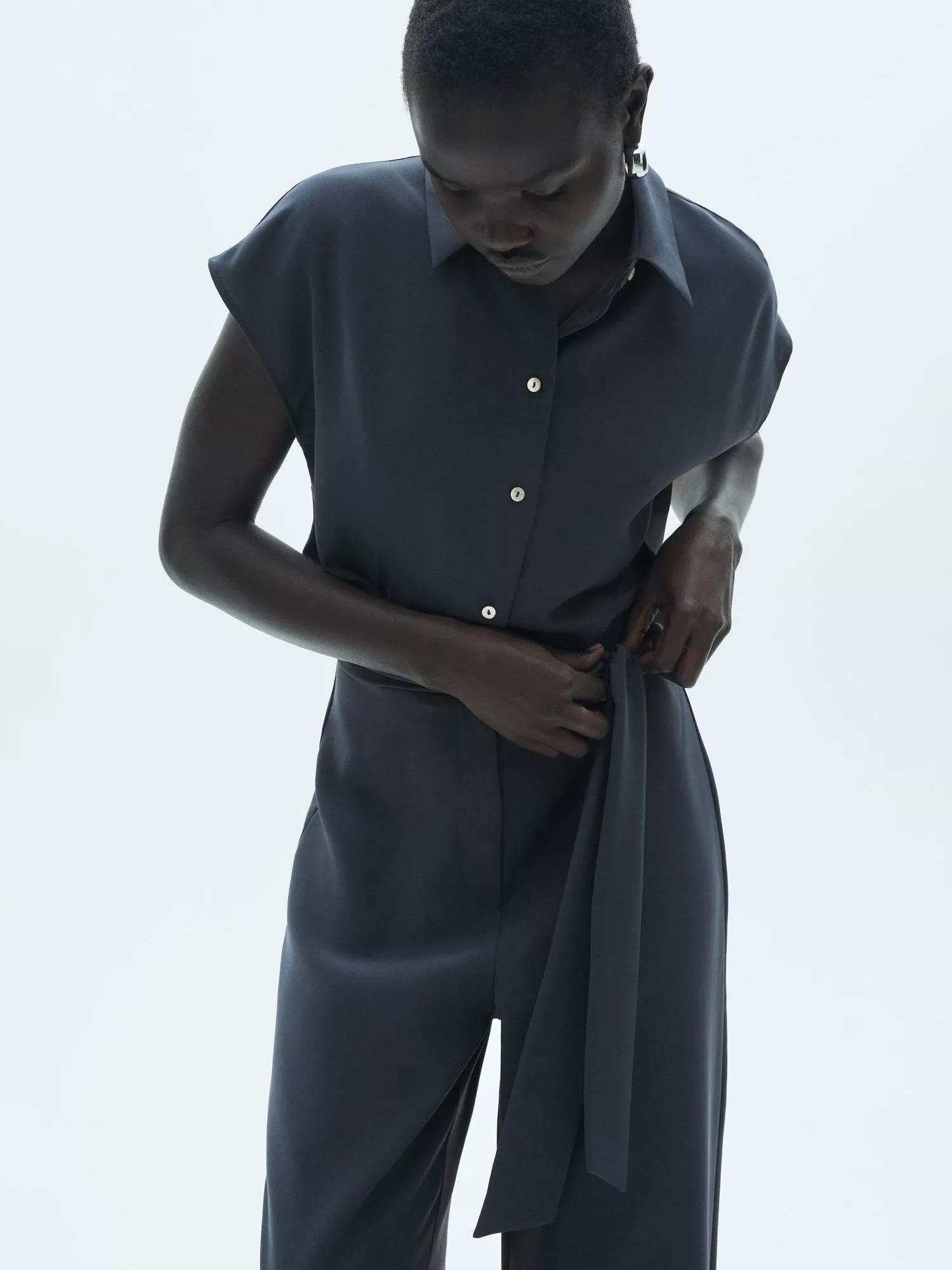 With a neat collar neckline and short sleeves, this button detail jumpsuit from Mango will keep you comfy with its featherweight fabrication.