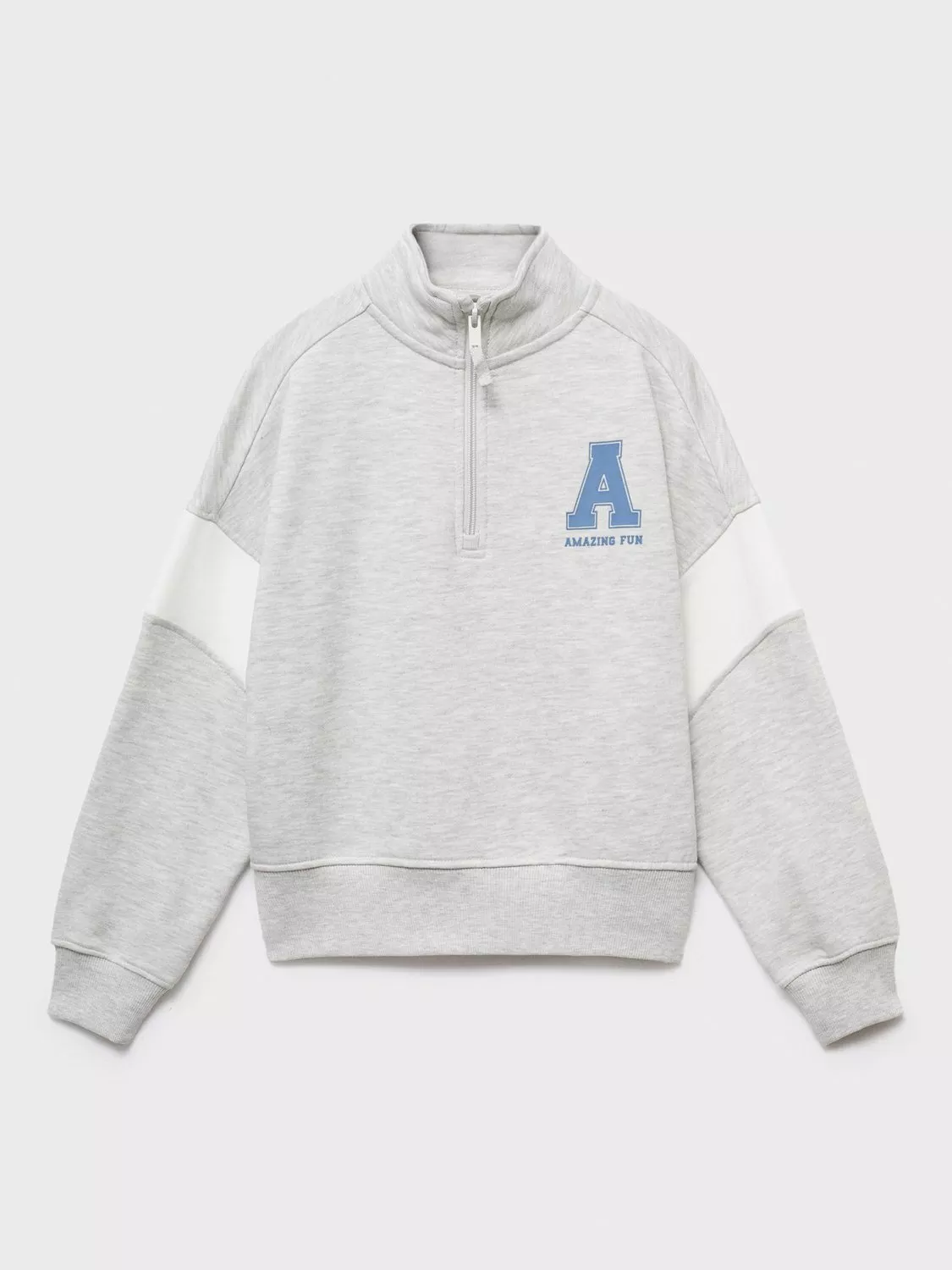 Two-tone hooded top with a printed A design.