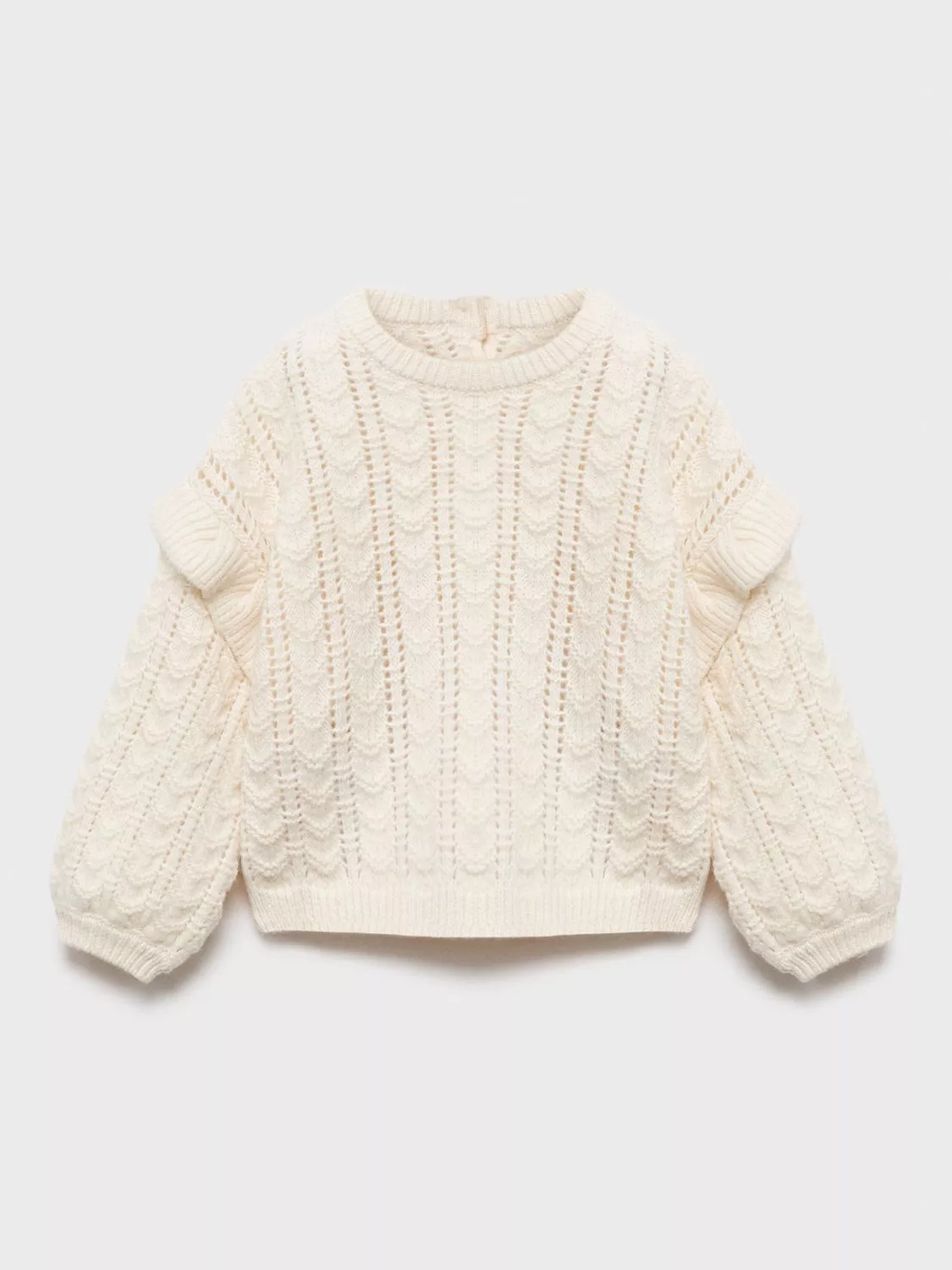 A sweet knit with an oversize fit for effortless style. Detailed with heart buttons, shoulder ruffles, and intricate crochet accents at the neckline, this long-sleeve piece is a charming addition to your casual wardrobe.