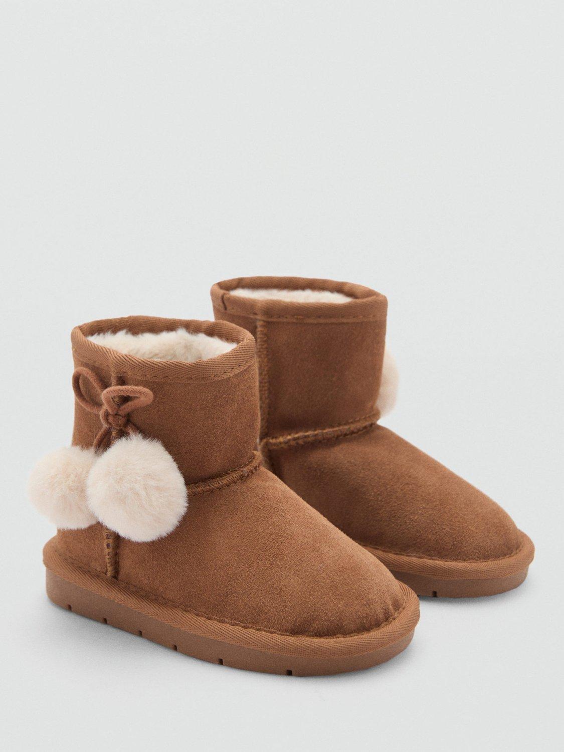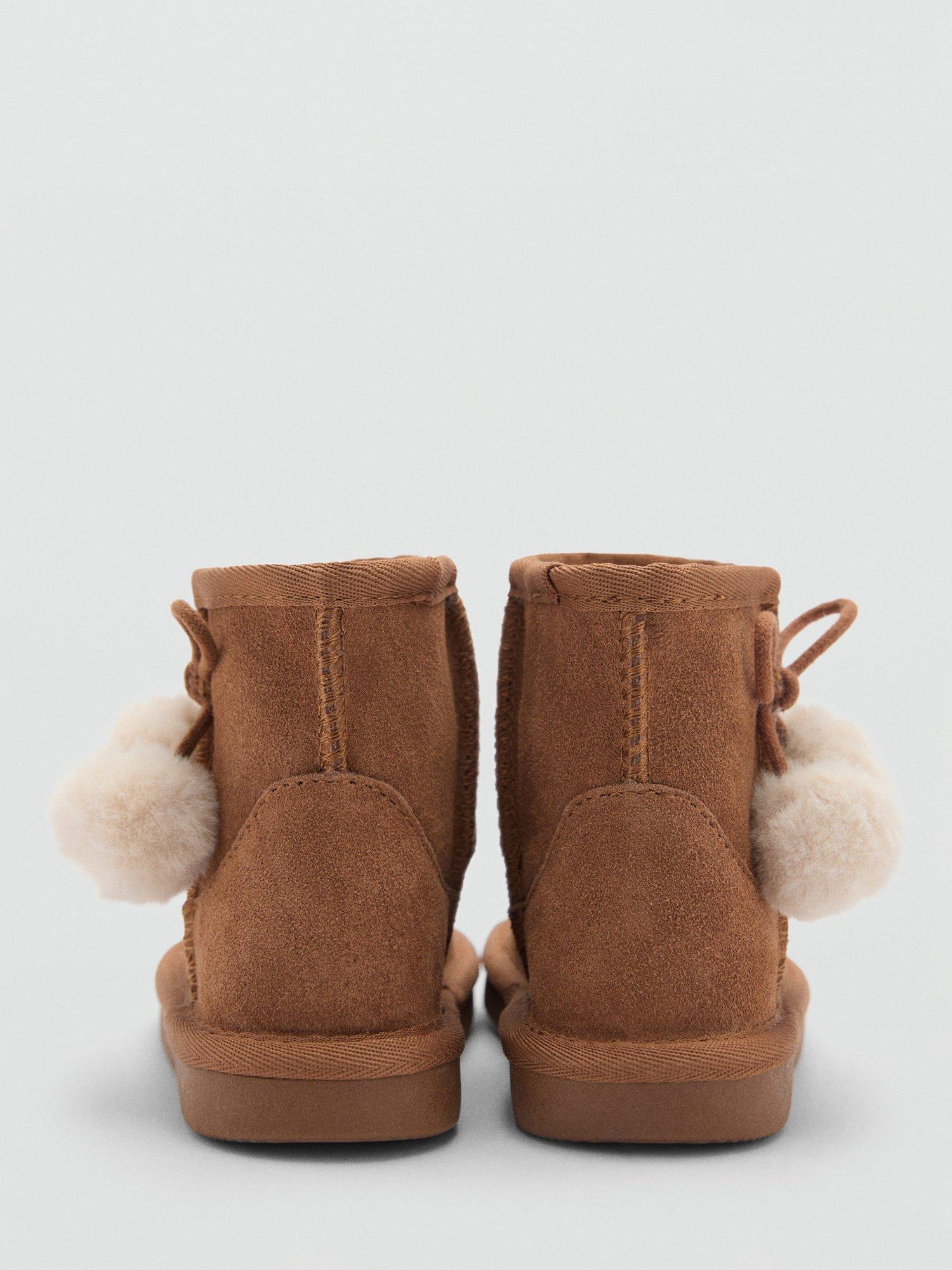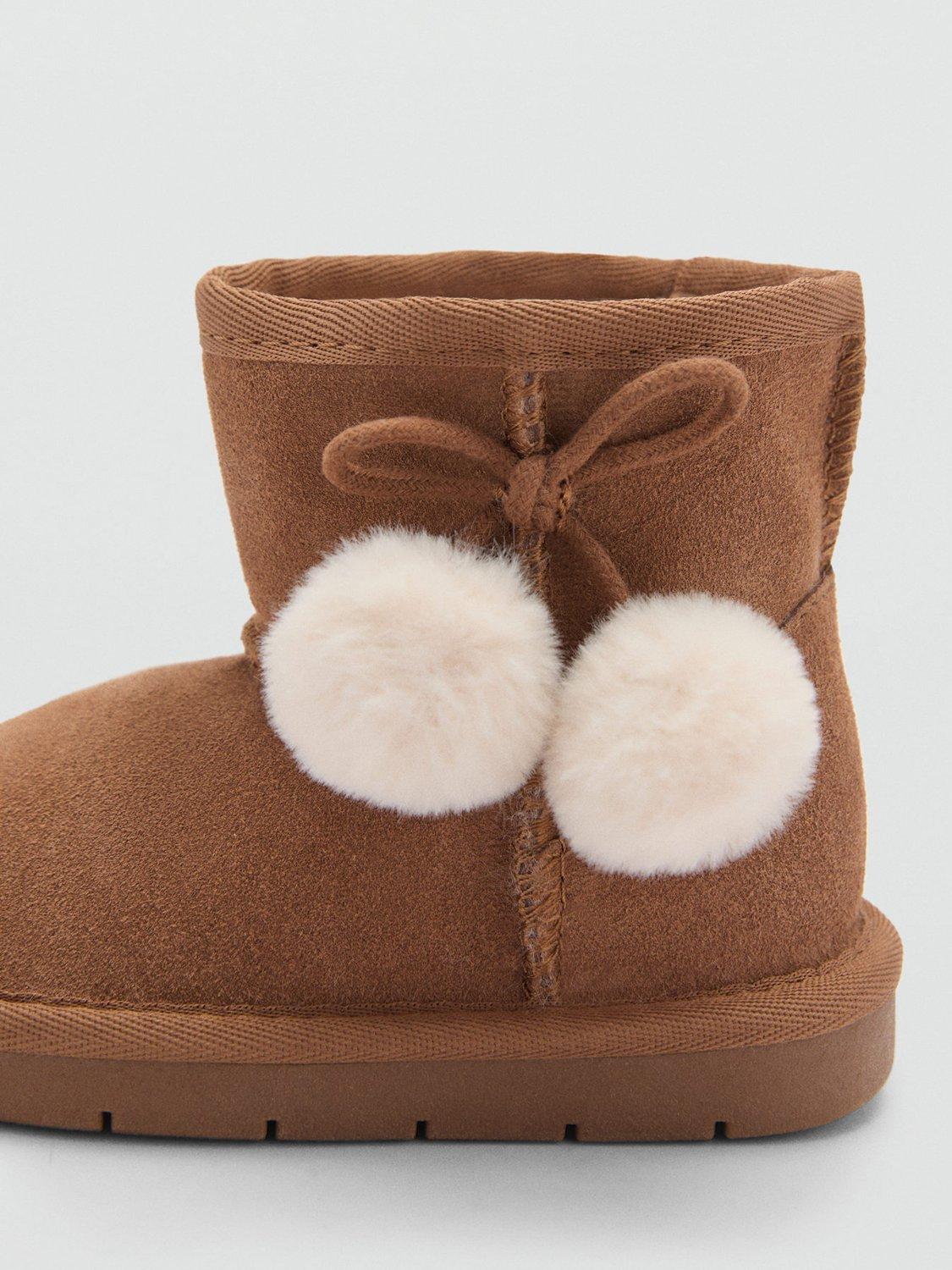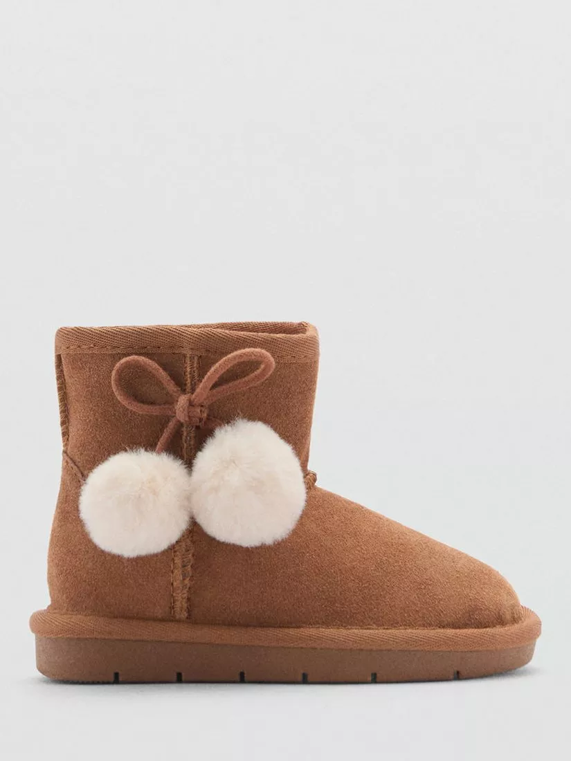 Suede ankle boots with a decorative bow and pom-poms for added texture and fun. Made with a rounded toe, flat heel and snug faux-fur lining for warmth and comfort.