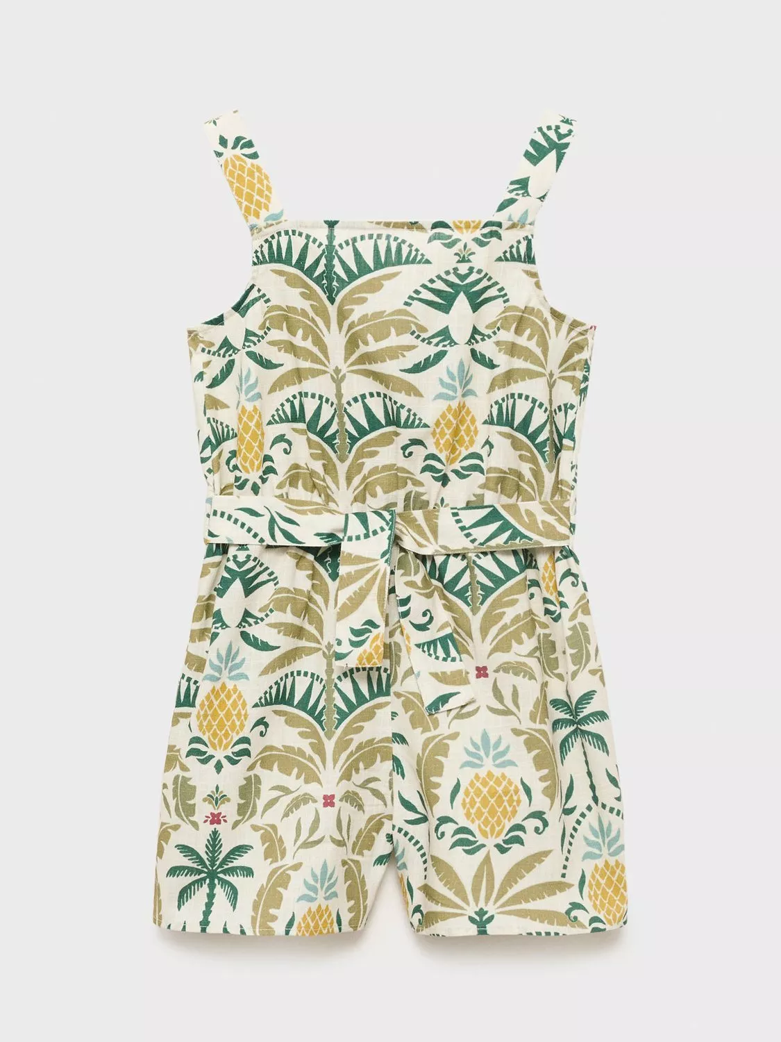This sleeveless playsuit features an open neck and playful palm tree pattern, crafted from soft cotton for comfort and easy movement during active days.