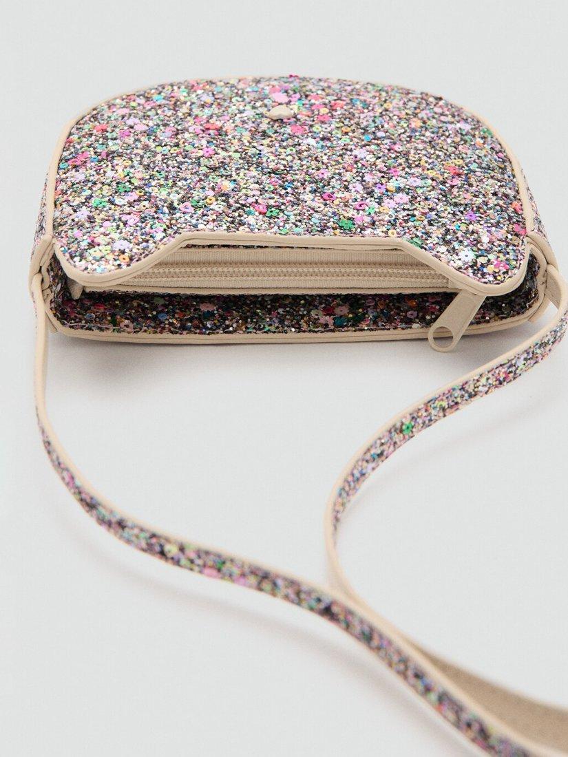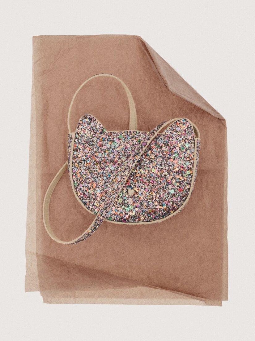 A compact cat cross body bag with a sparkling finish and a slim strap for hands free evenings. Perfect for parties.