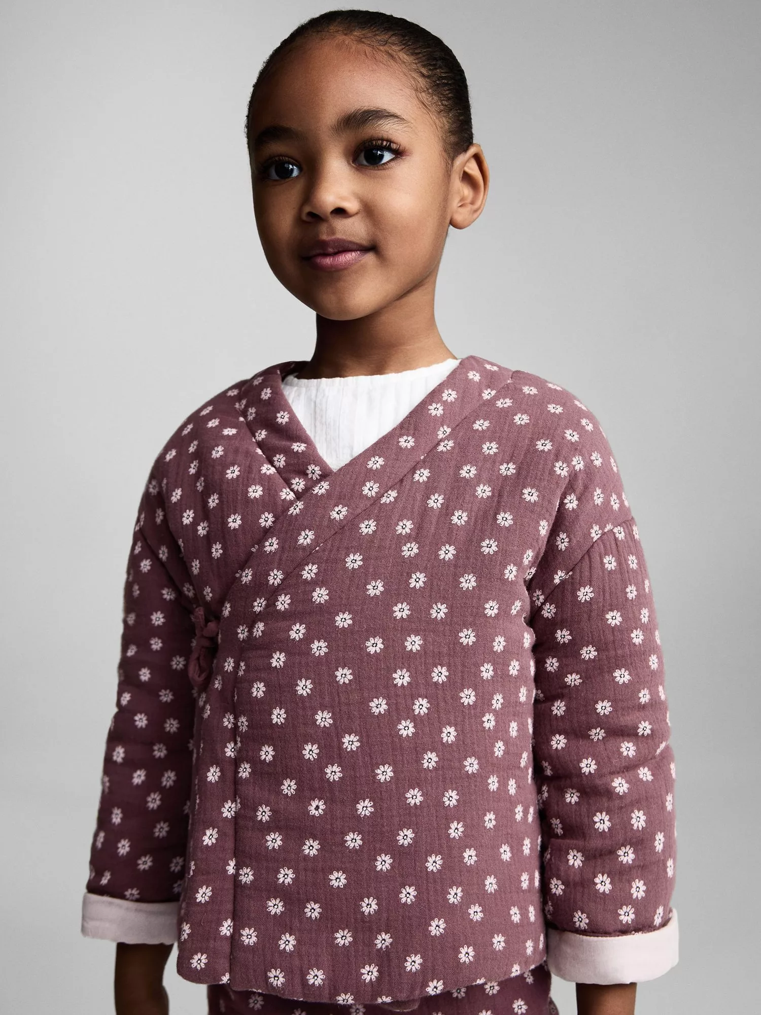 A lightweight, wrap-over jacket with a floral print and tie closure.