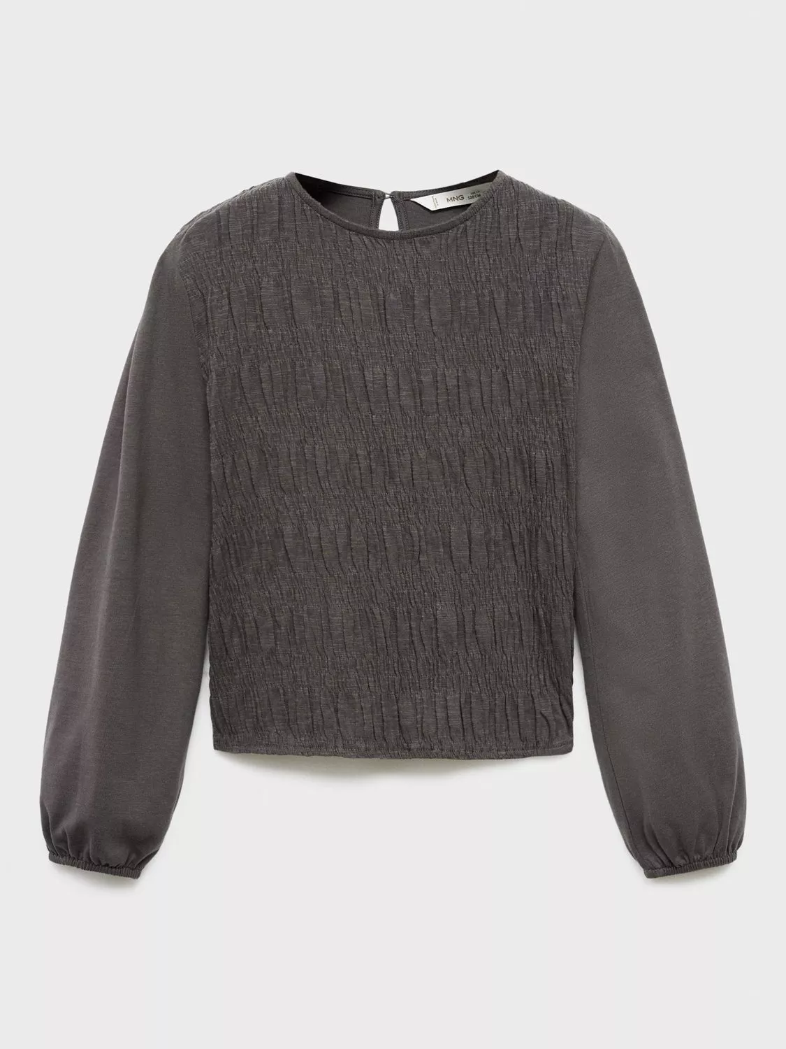 Crafted from a breathable cotton blend with a hint of stretch, this long-sleeved top features a ruched panel to the front, a rounded neckline and elasticated cuffs. Finished with a button closure at the back for easy dressing.