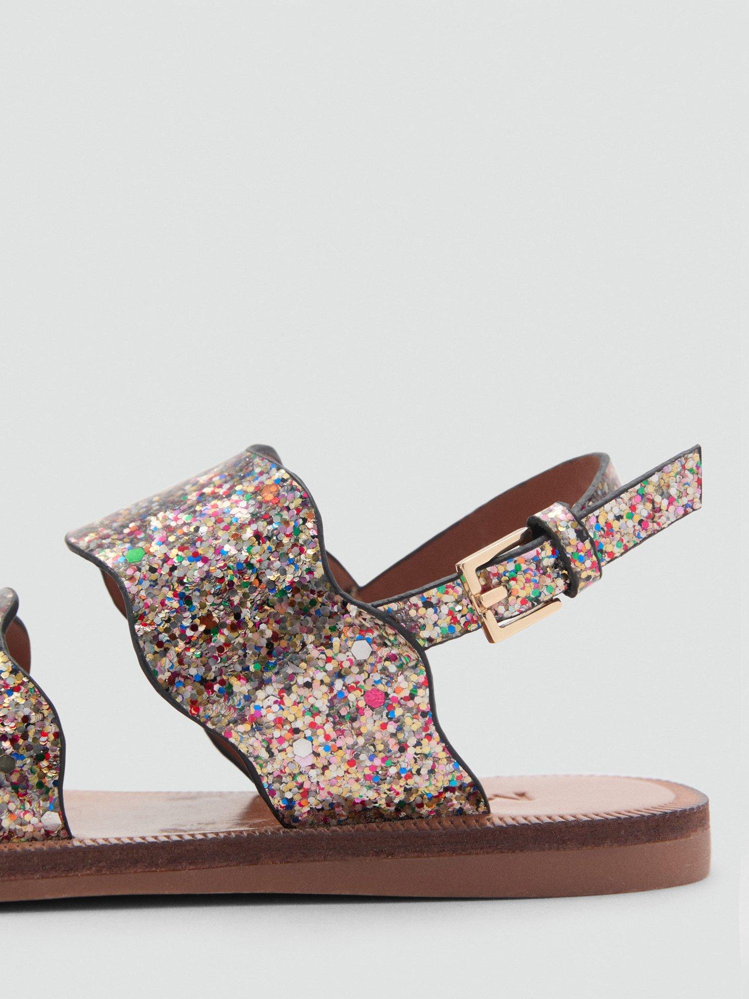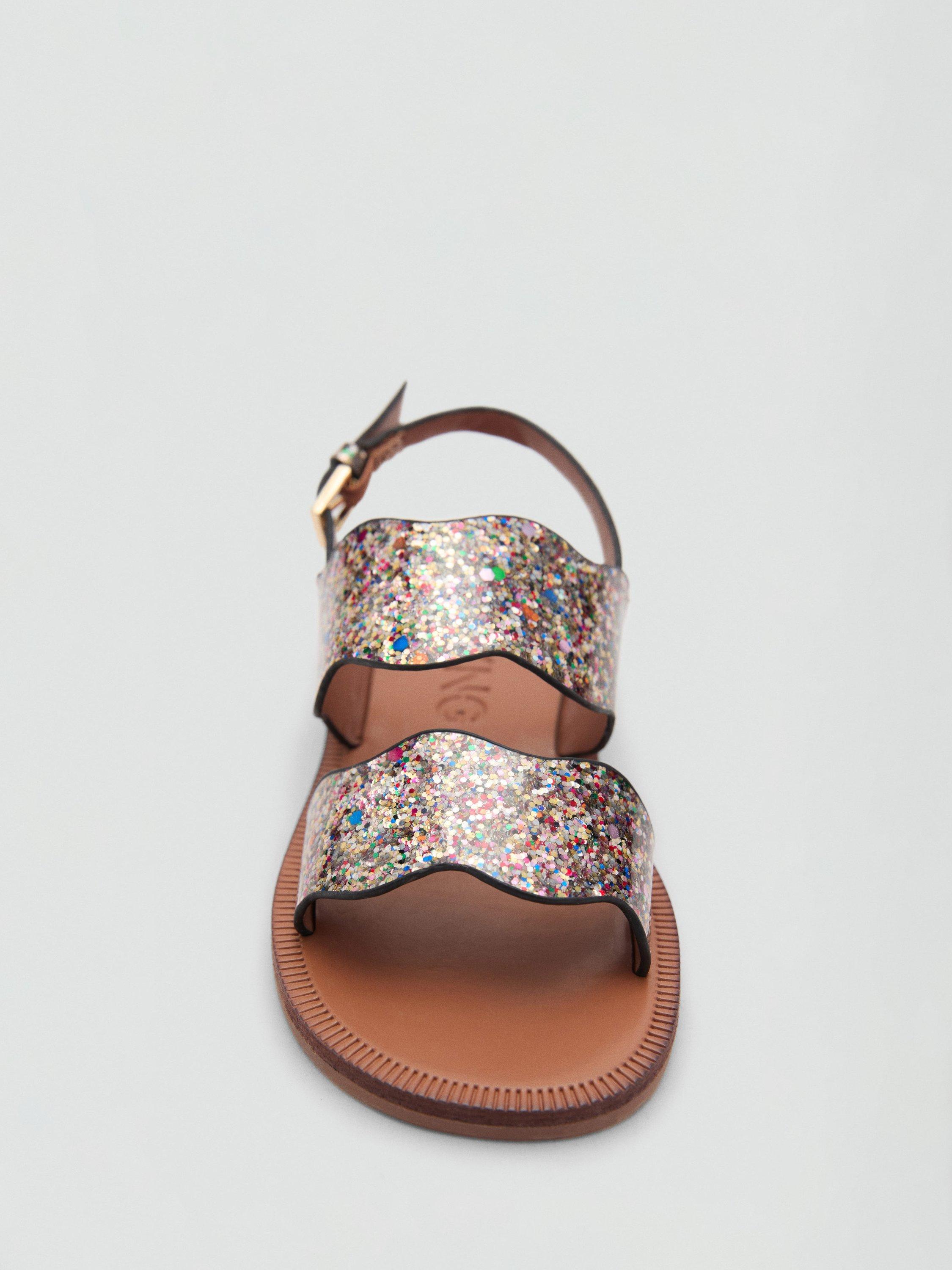Strappy sandals with a glittery texture and buckle closure.