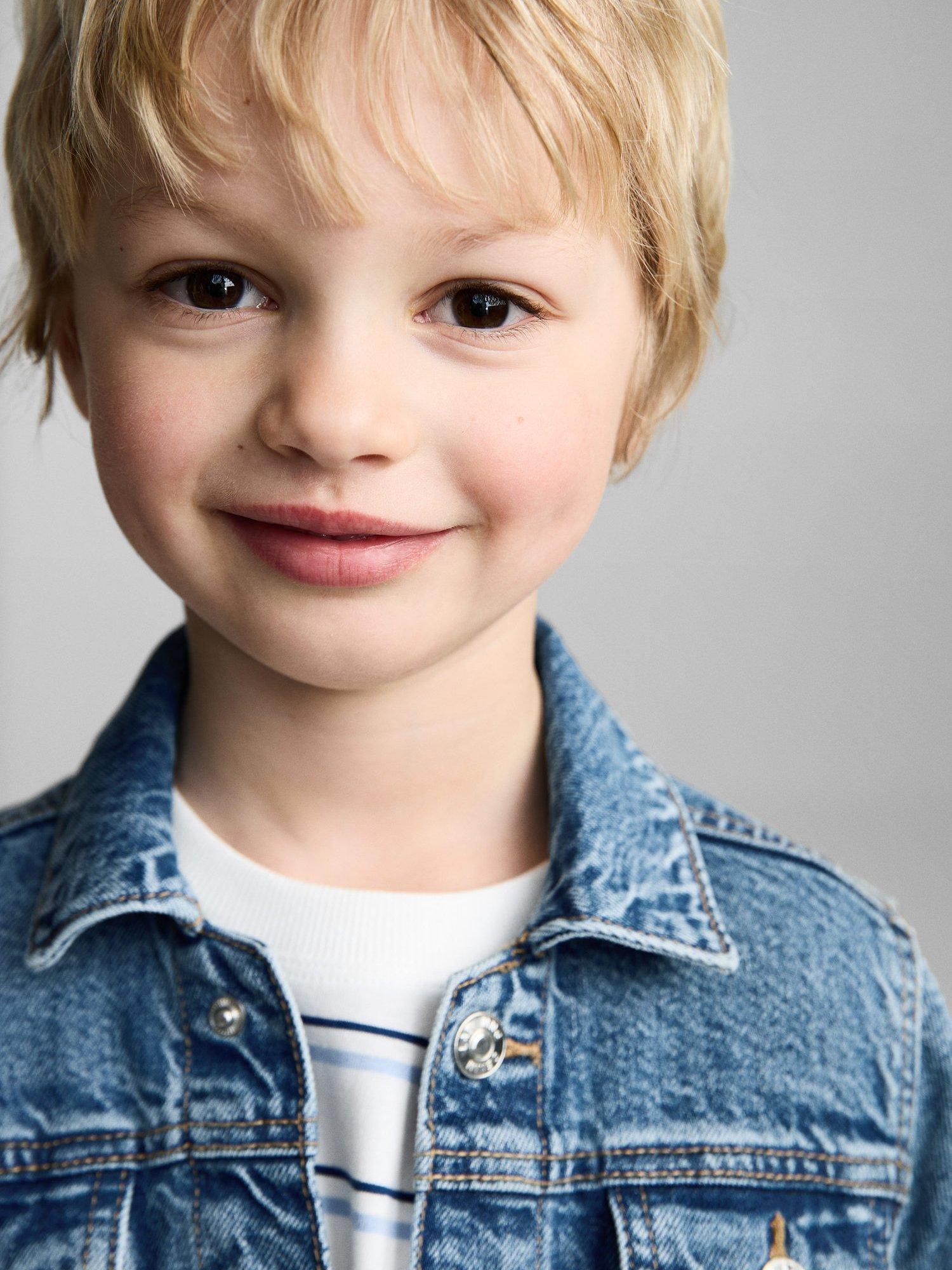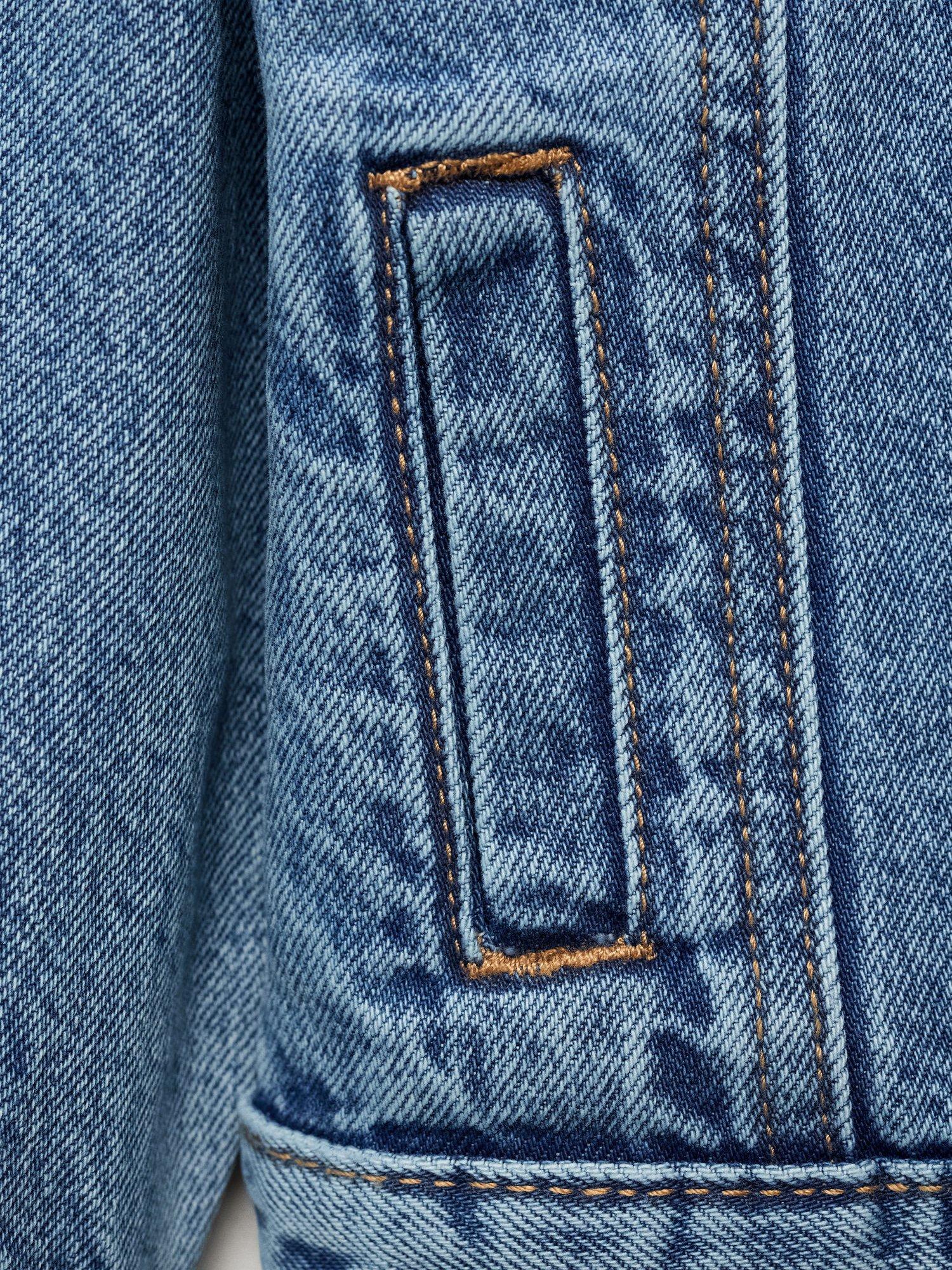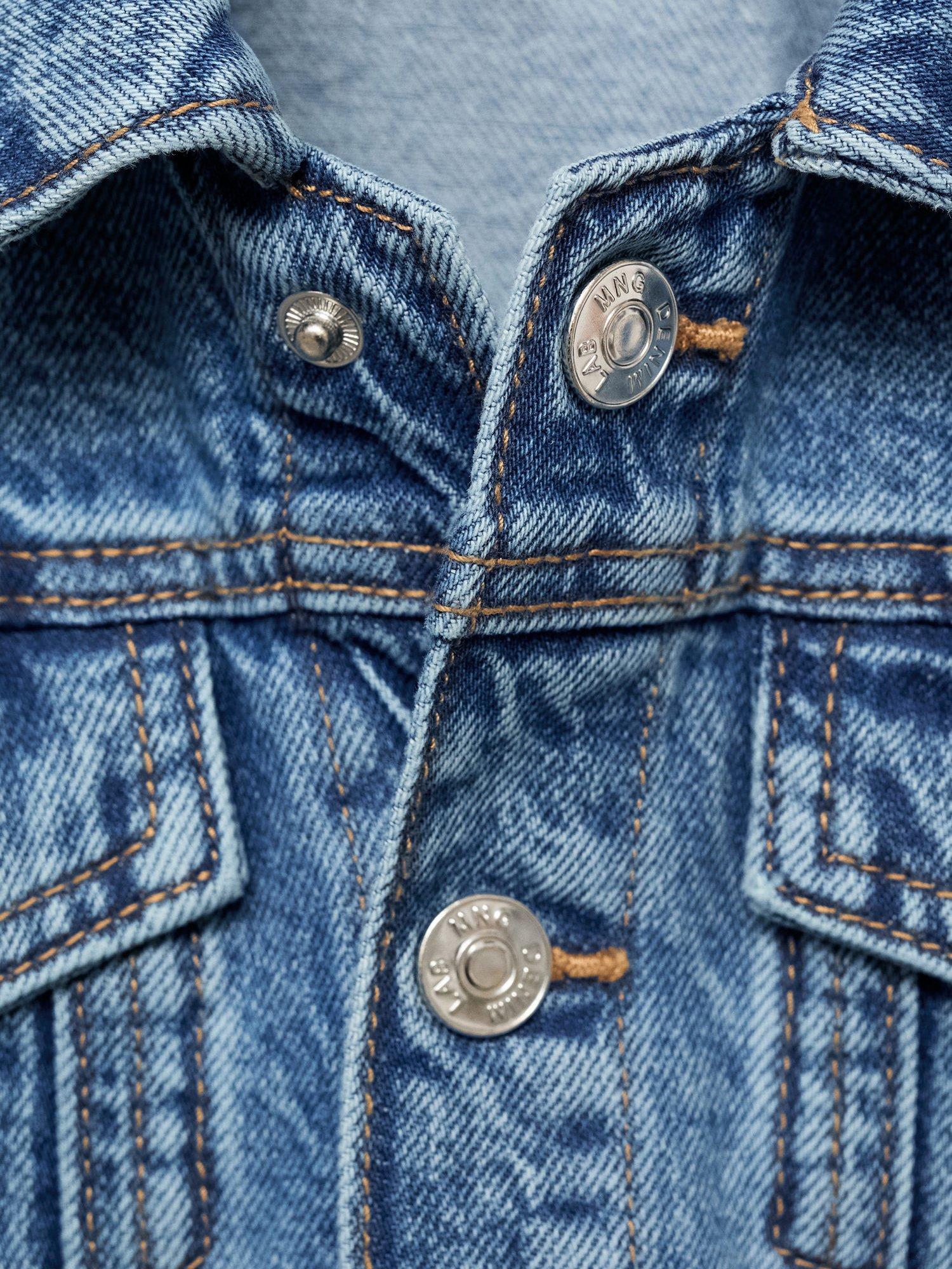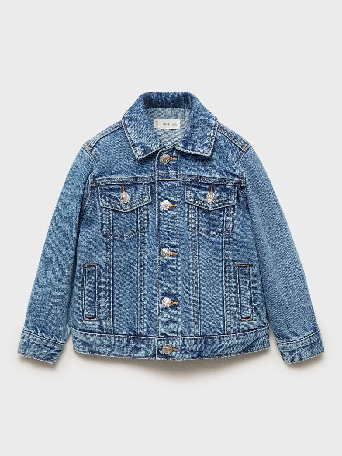 Jacket made in a denim-style cotton fabric with a straight design, long sleeves with buttoned cuffs, two flap and button pockets on the front, two side pockets and button front closure.