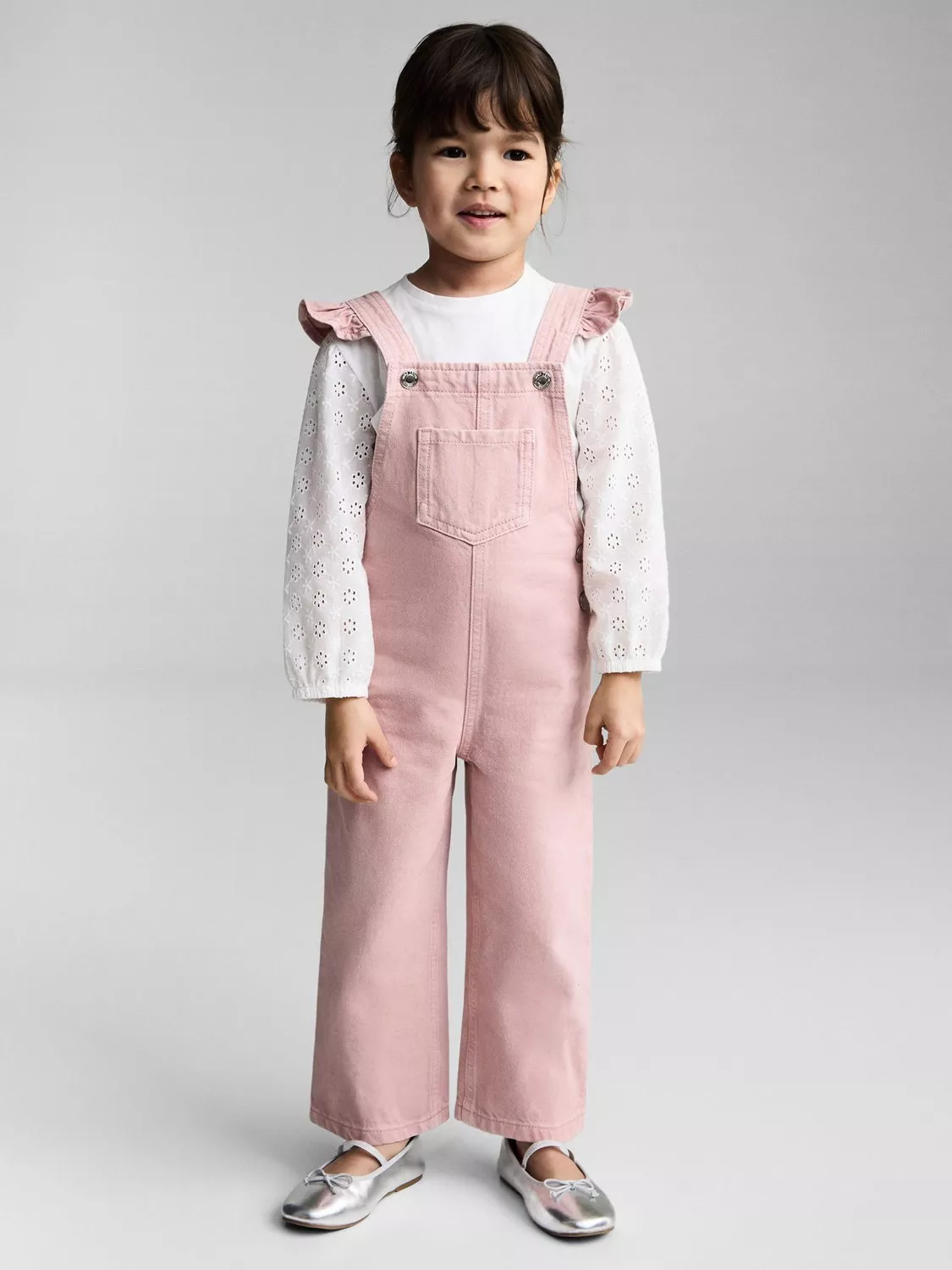 Full-length denim dungarees in a beautiful blush pink. Ruffle details on the shoulder straps and a front patch pocket complete the look.