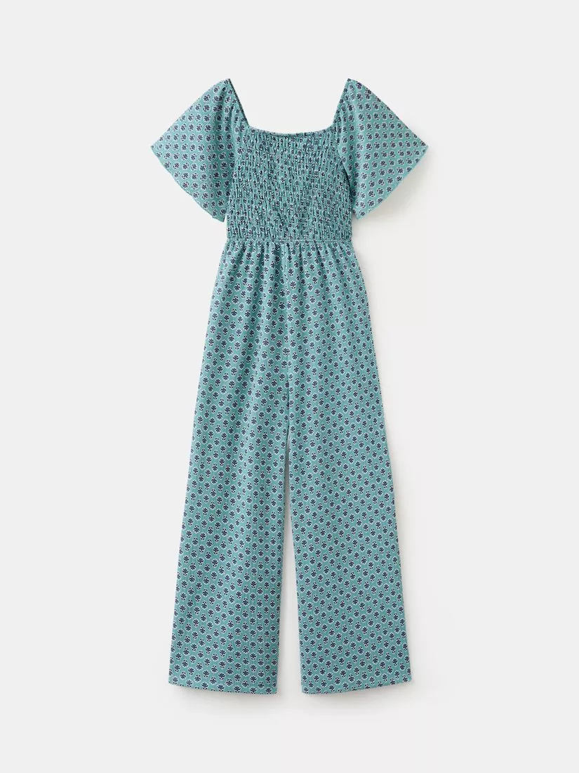 This short sleeve jumpsuit features a floral pattern, square neck, shirred bodice and culotte legs, offering kids a stylish yet comfortable look for everyday adventures.