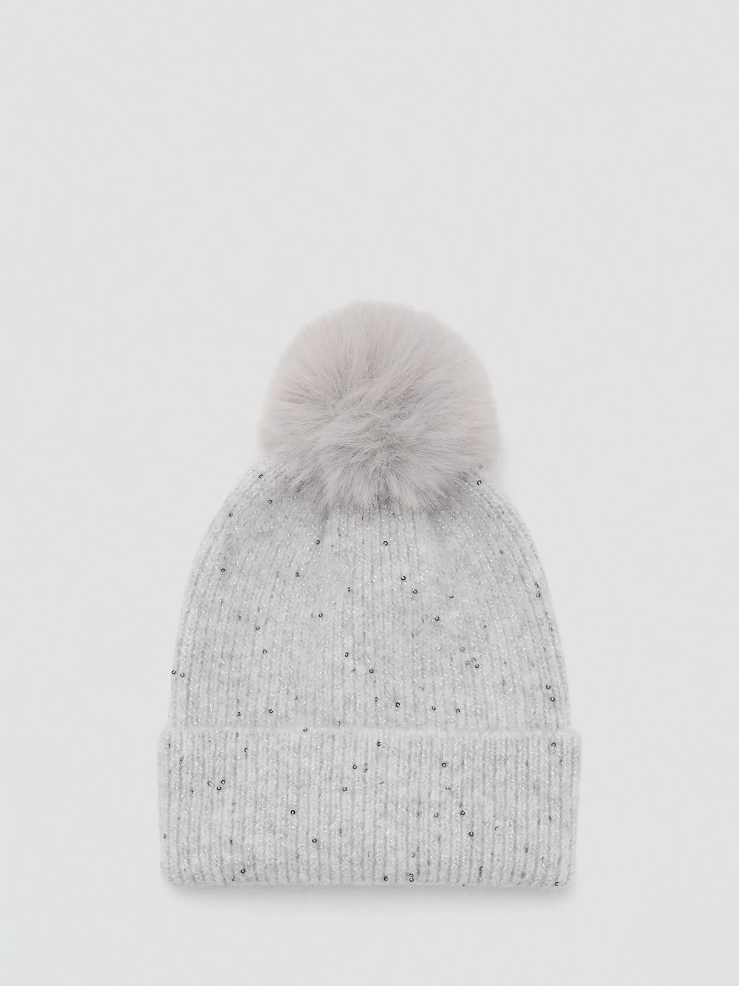 Perfect for keeping little heads warm, this fluffy knitted hat is decorated with sparkly sequins and finished with a soft pom-pom.