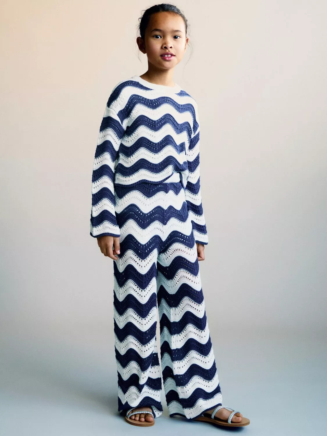 100% Cotton in an oversize design, this crochet style medium knit jumper has an all-over, contrast wave stripe.