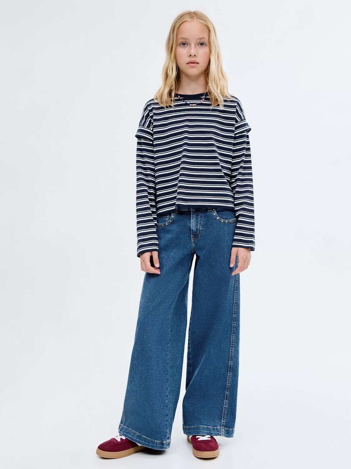 The wide-leg design of these jeans is detailed with subtle studs for an edgy finish. They include a secure button and zip fastening, belt loops on the waist, two practical side pockets, and two patch pockets at the back.