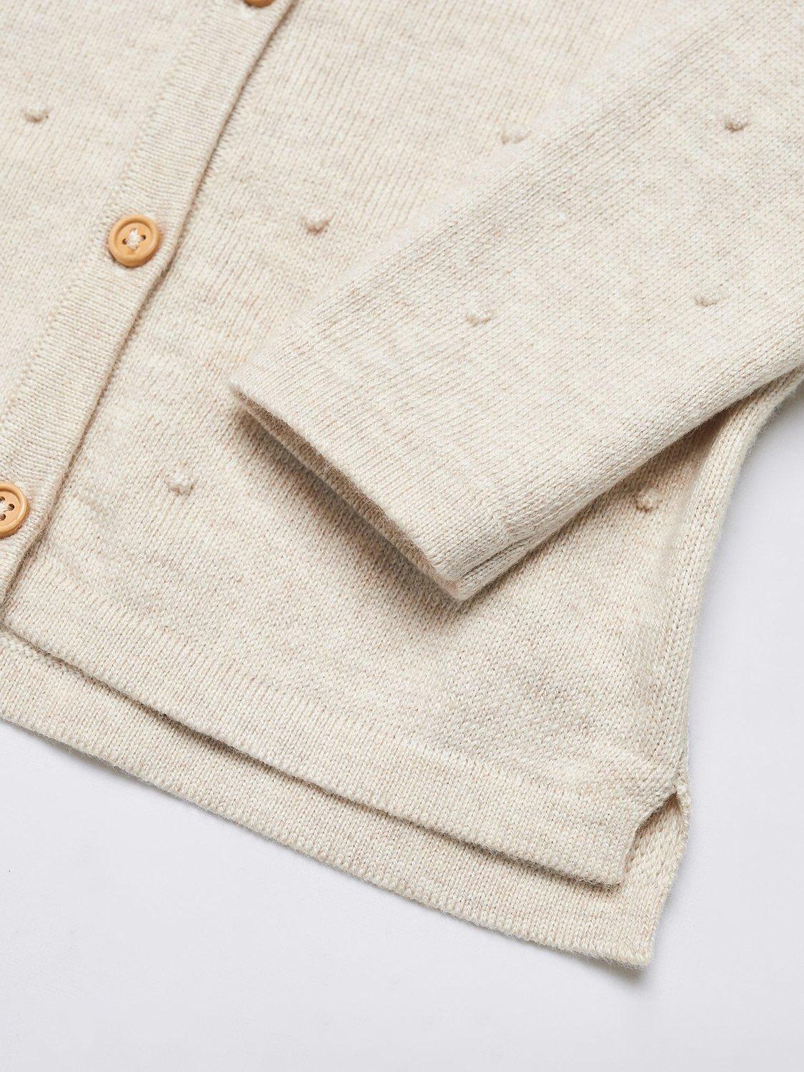 A fine knit cotton blend cardigan with a textured spot design.