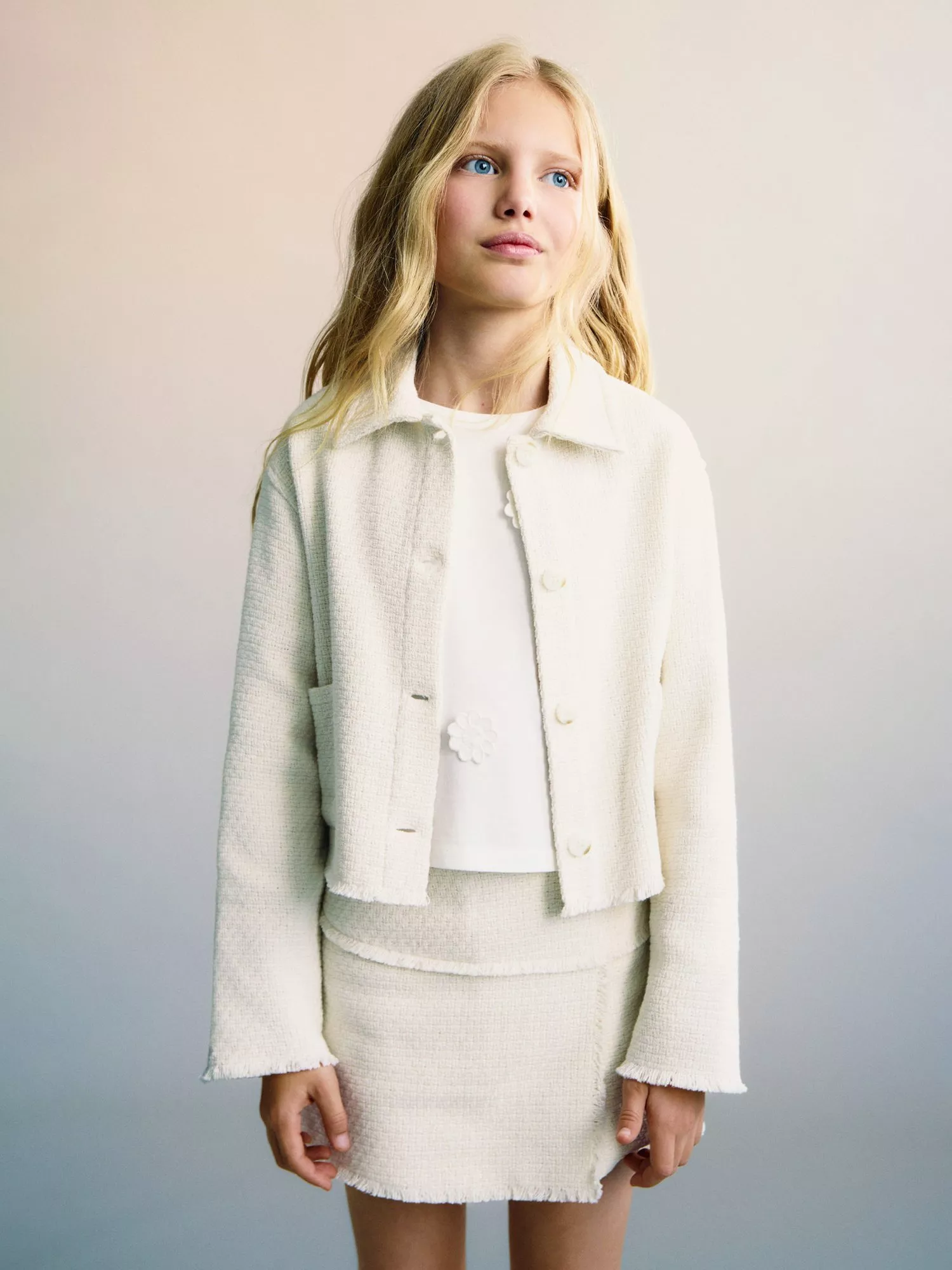 Made from a soft cotton blend in a lightly textured design, this boxy fit jacket from Mango features a shirt-collar neck, long sleeves with frayed cuffs and buttons through the front. Wear with the matching skirt for the ultimate co-ord.